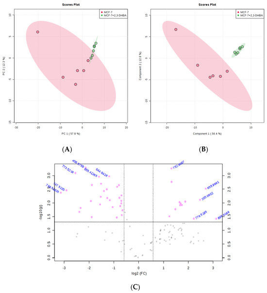 Effect of 2,3-DHBA exposure on the relative abundance of lipids in MCF-7 cells. MCF-7 cells were treated with either DMSO (control) or the IC50 concentration of 2,3-DHBA (8.61 mM) for NIM. Forty-eight hours after treatment, cells were collected, subjected to Bligh–Dyer extraction, and analyzed using ESI-MS. (A) PCA of lipids extracted from DMSO-treated cells (red) and 2,3-DHBA-treated cells (green). Each data point represents an individual replicate. The ovals represent 95% confidence intervals. (B) PLS-DA of lipids extracted from DMSO-treated cells (red) and 2,3-DHBA-treated cells (green). Each data point represents an individual replicate. The ovals represent 95% confidence intervals. (C) Volcano plot analysis comparing the log fold change of each m/z value (X-axis) to the significance value (Y-axis) for pairwise comparisons between the DMSO-treated (control) and 2,3-DHBA treatment groups. The identity of select m/z values is indicated next to each data point. Pink dots indicate significantly changed lipids, while gray dots indicate lipids that did not change significantly. All features presented are considered significant based on a fold change threshold of ≥2.00 and t-tests where p ≤ 0.05.