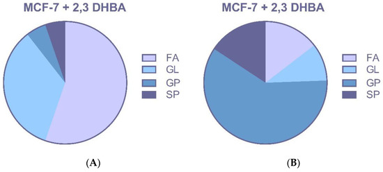 Treatment with 2,3-DHBA induced alterations in multiple lipid classes, including fatty acids, glycerolipids, glycerophospholipids, and sphingolipids in breast cancer cells (Figure 6A,B and Figure 7A,B). The identification of these lipid class changes represents a valuable approach for investigating lipid profile modifications in cancer, providing a foundation for the development of novel biomarkers and therapeutic strategies.