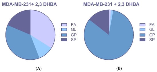 MDA-MB-231 cells were treated with the IC50 of 2,3-DHBA (5.48 mM). Forty-eight hours after the treatment, cells were collected, subjected to Bligh–Dyer extraction, and analyzed using ESI–MS. Changed lipid classes: (A) PIM; (B) NIM. (FA: Fatty acid, GL: Glycerolipid, GP: Glycerophospholipid, SP: Sphingolipid).