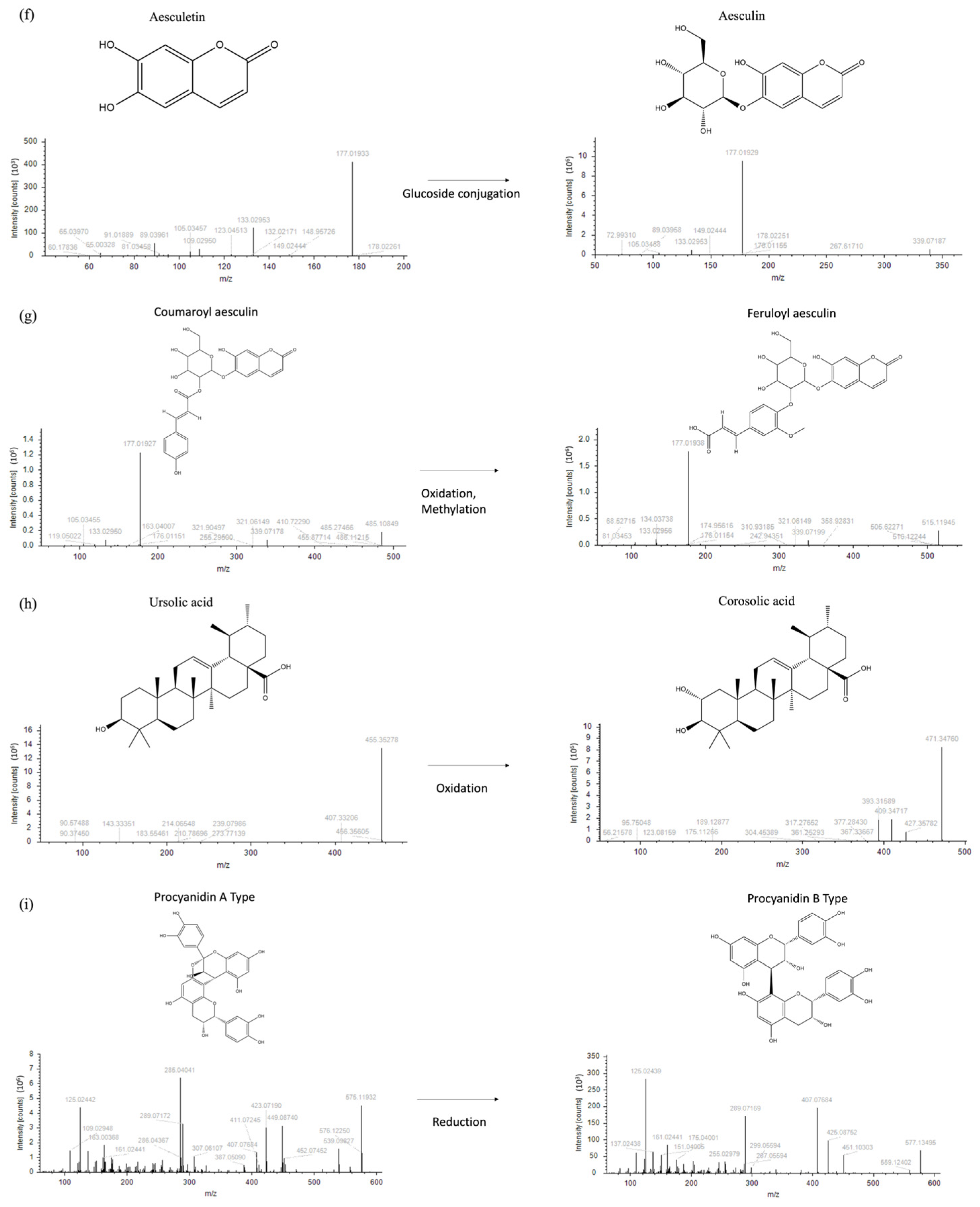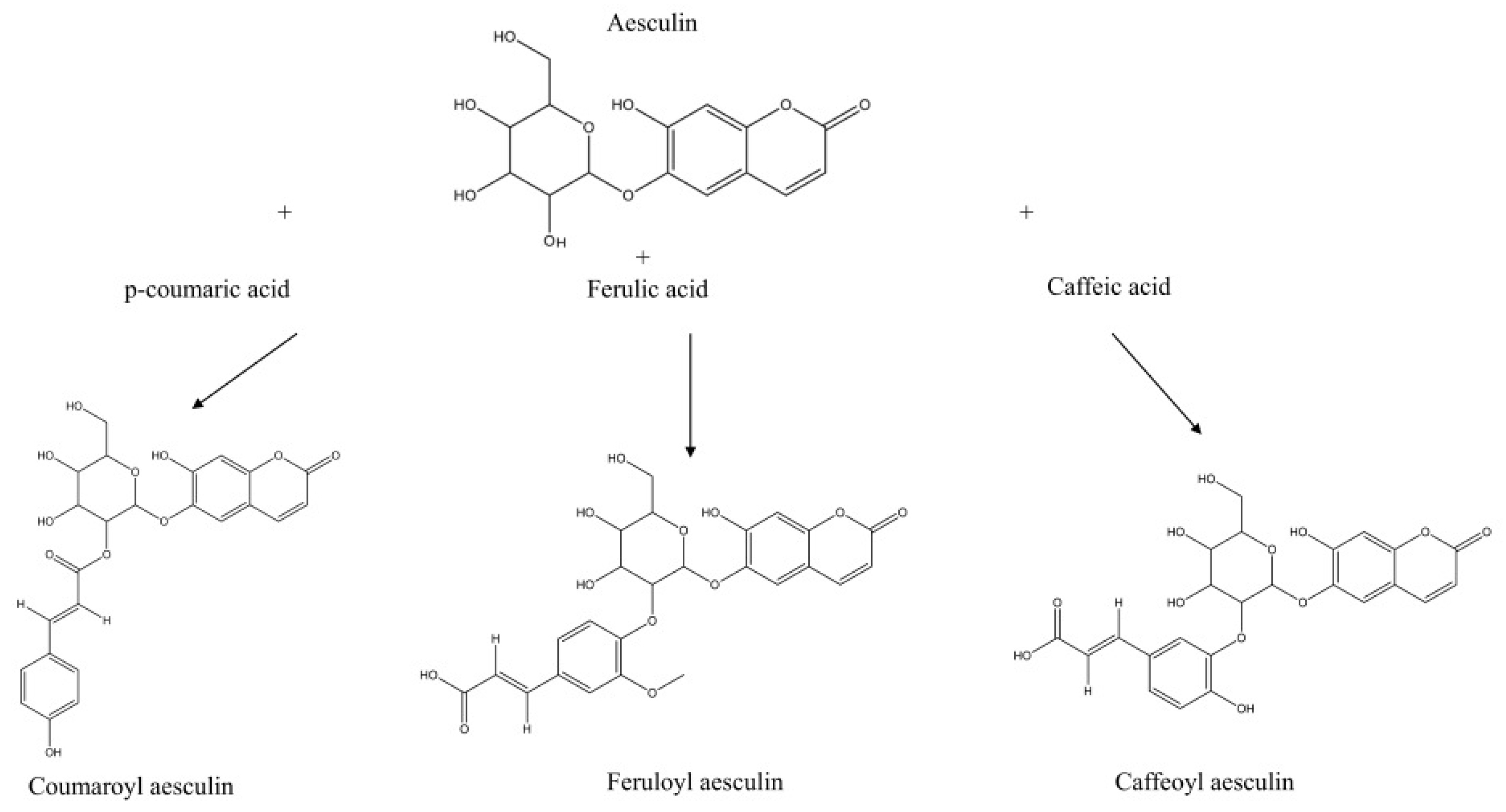 - Wang, Z.; Zhu, W.; Liu, H.; Wu, G.; Song, M.; Yang, B.; Yang, D.; Wang, Q.; Kuang, H. Simultaneous Determination of Aesculin, Aesculetin, Fraxetin, Fraxin and Polydatin in Beagle Dog Plasma by UPLC-ESI-MS/MS and Its Application in a Pharmacokinetic Study after Oral Administration Extracts of Ledum palustre L. Molecules 2018, 23, 2285. [Google Scholar] [CrossRef] [PubMed]