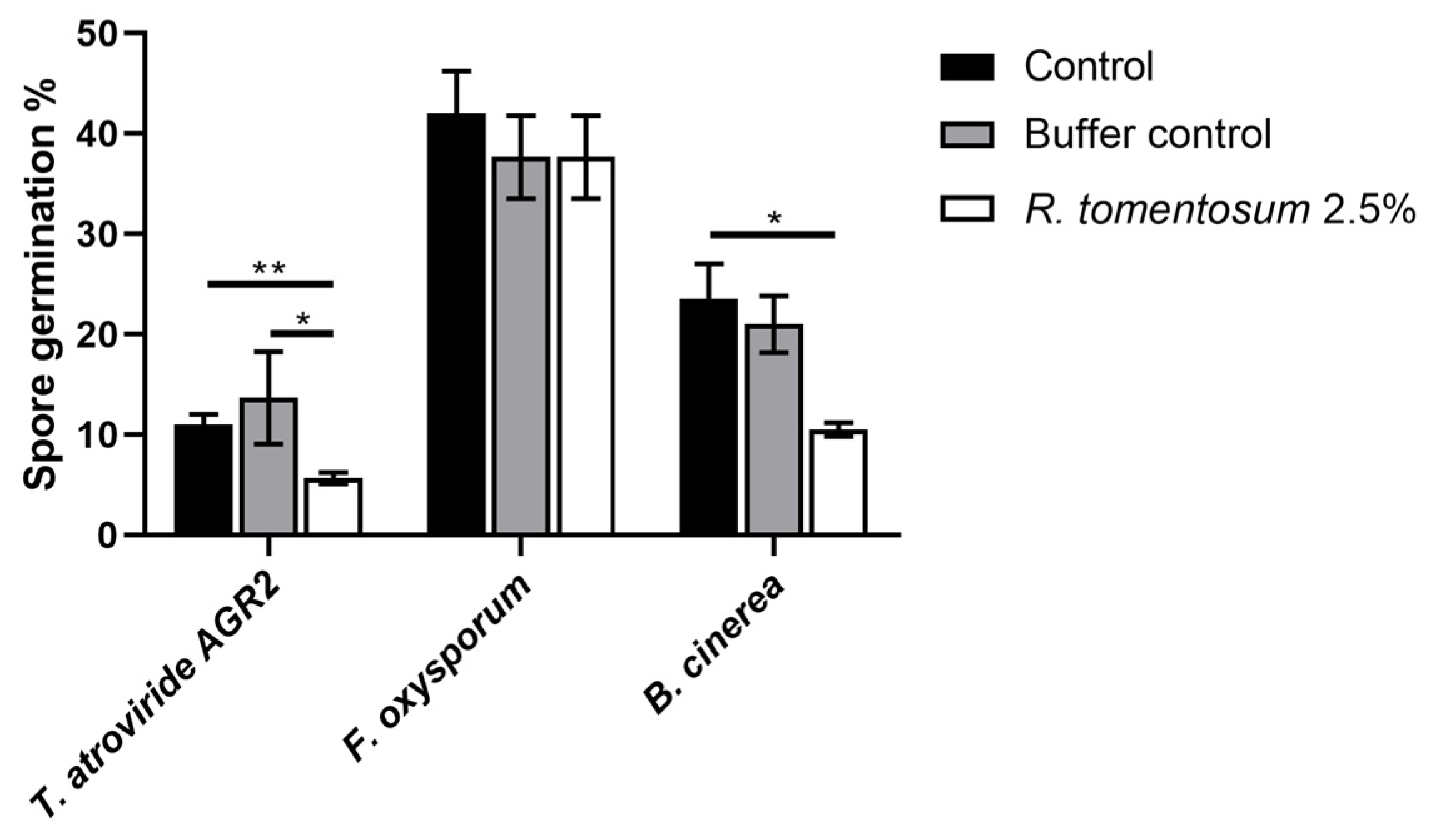 3.2.5. Effect of R. tomentosum Hydroalcoholic Extract on Fungal Spore Germination