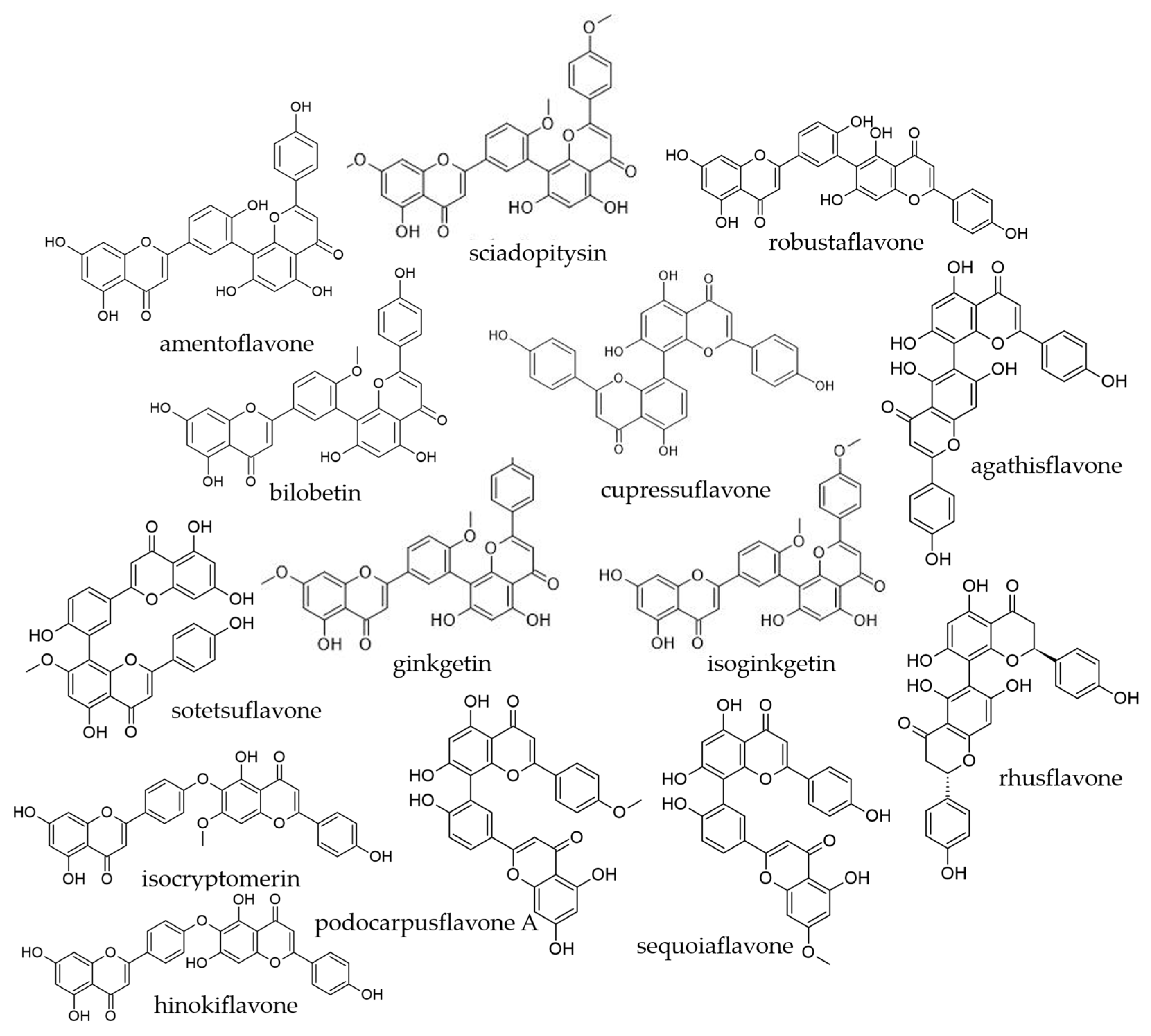 | Ginko biloba L. | 3′,8″ | ginkgetin, isoginkgetin, amentoflavone, bilobetin, sciadopitysin, sesquoiaflavone, podocarpusflavone A, and 5′-metoxybilobetin [19] |