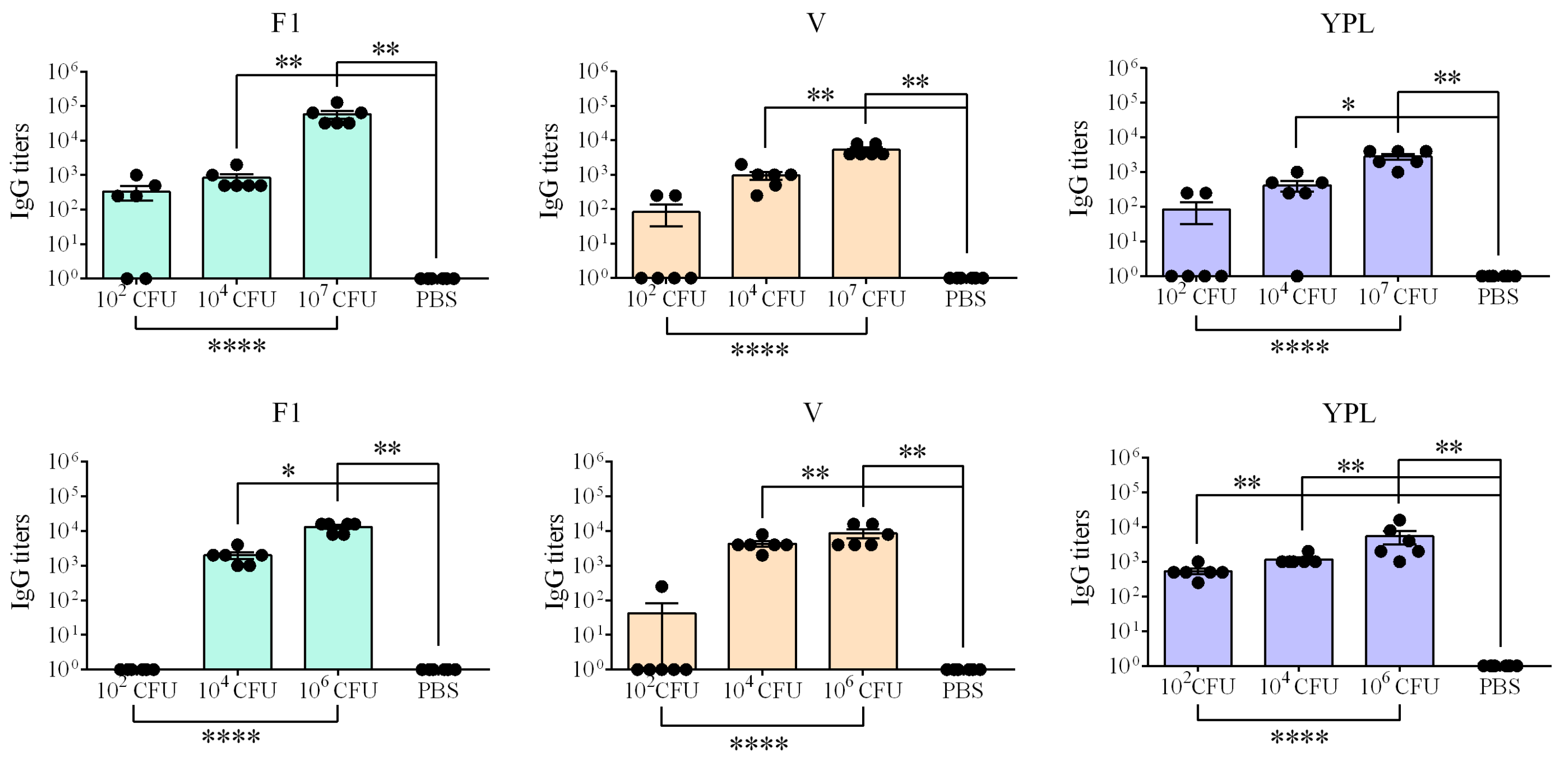 Sera were collected from vaccinated mice and guinea pigs 28 days after immunization. The levels of serum IgG titers against two main immunodominant Y. pestis protective antigens (F1 and LcrV) and Y. pestis whole-cell lysate (YPL) were determined via ELISA (Figure 5). Anti-F1 (p < 0.0001), anti-LcrV (p < 0.0001), and anti-YPL (p < 0.0001) IgG titers in mice and guinea pigs increased in a dose-dependent manner when the levels of IgG induced by different immunized doses were compared. The differences in the levels of IgG to Y. pestis antigens in the sera of mice and guinea pigs immunized with 102 CFU were insignificant (p > 0.05).