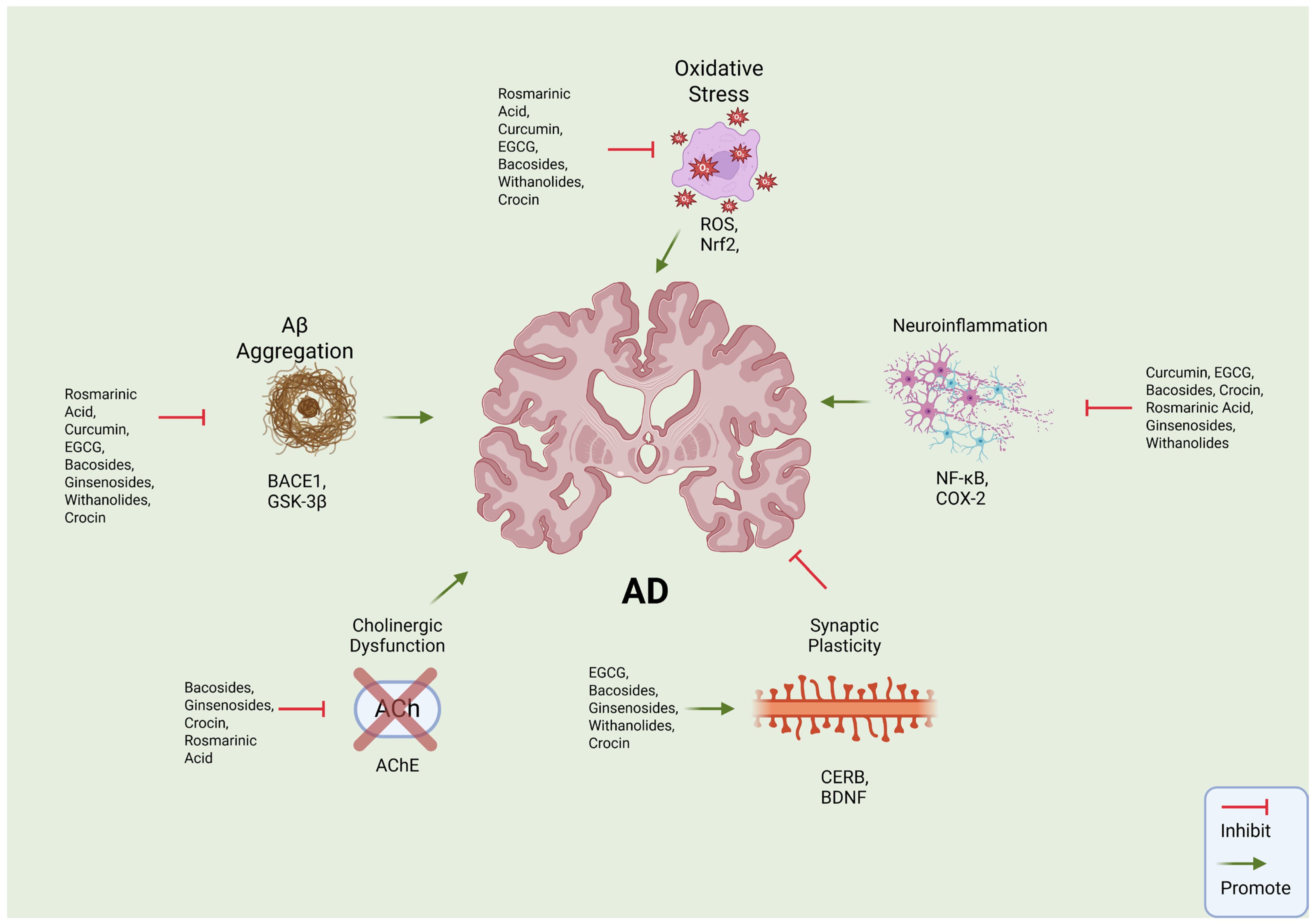 | Amyloid Cascade | Aberrant APP cleavage by β- and γ-secretase. | BACE1, GSK-3β, ADAM10 | Curcumin, Bacosides, EGCG, Withanolide A [13,15,18,19,37,40,41,49,71,75,81]. |