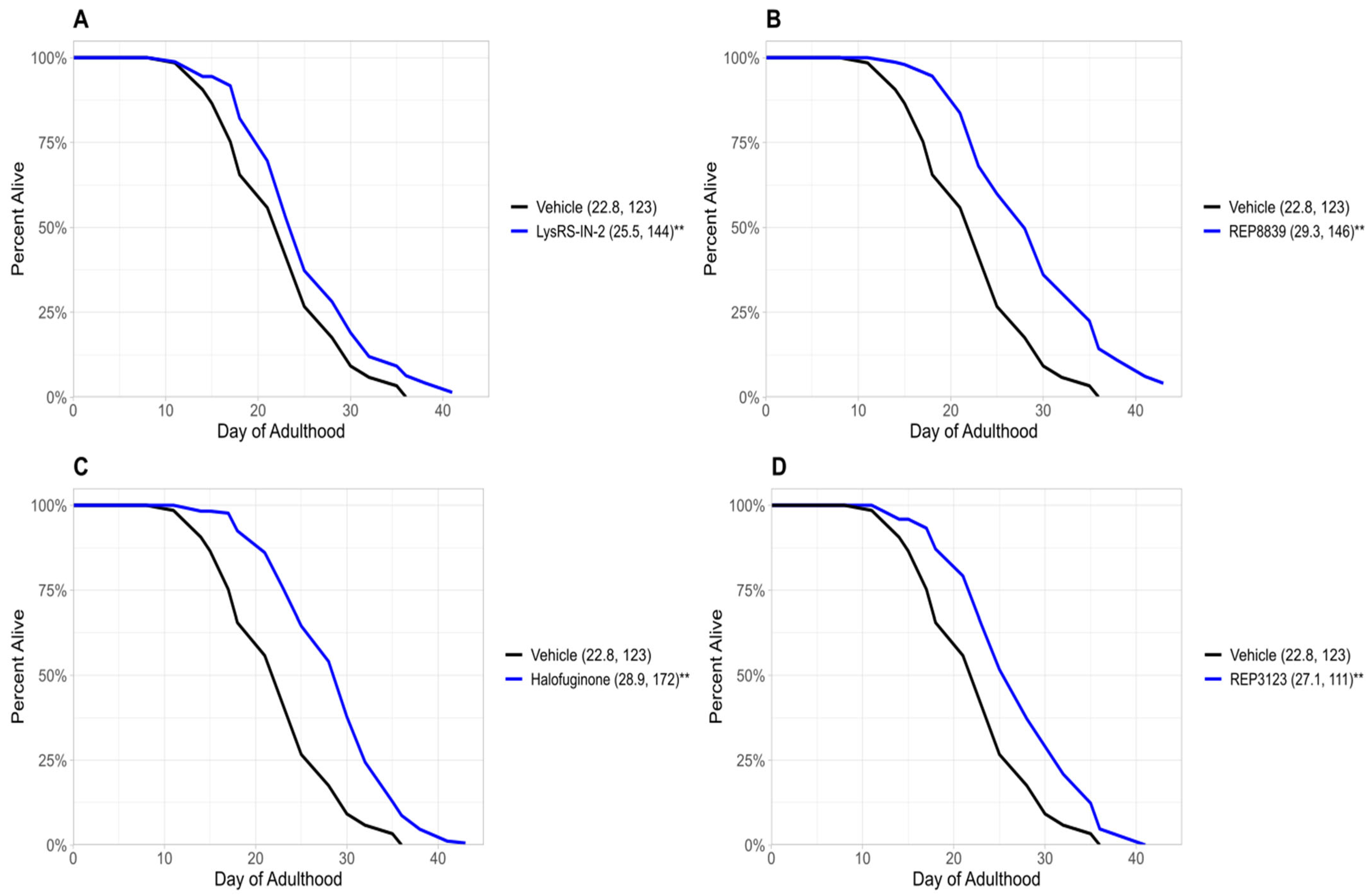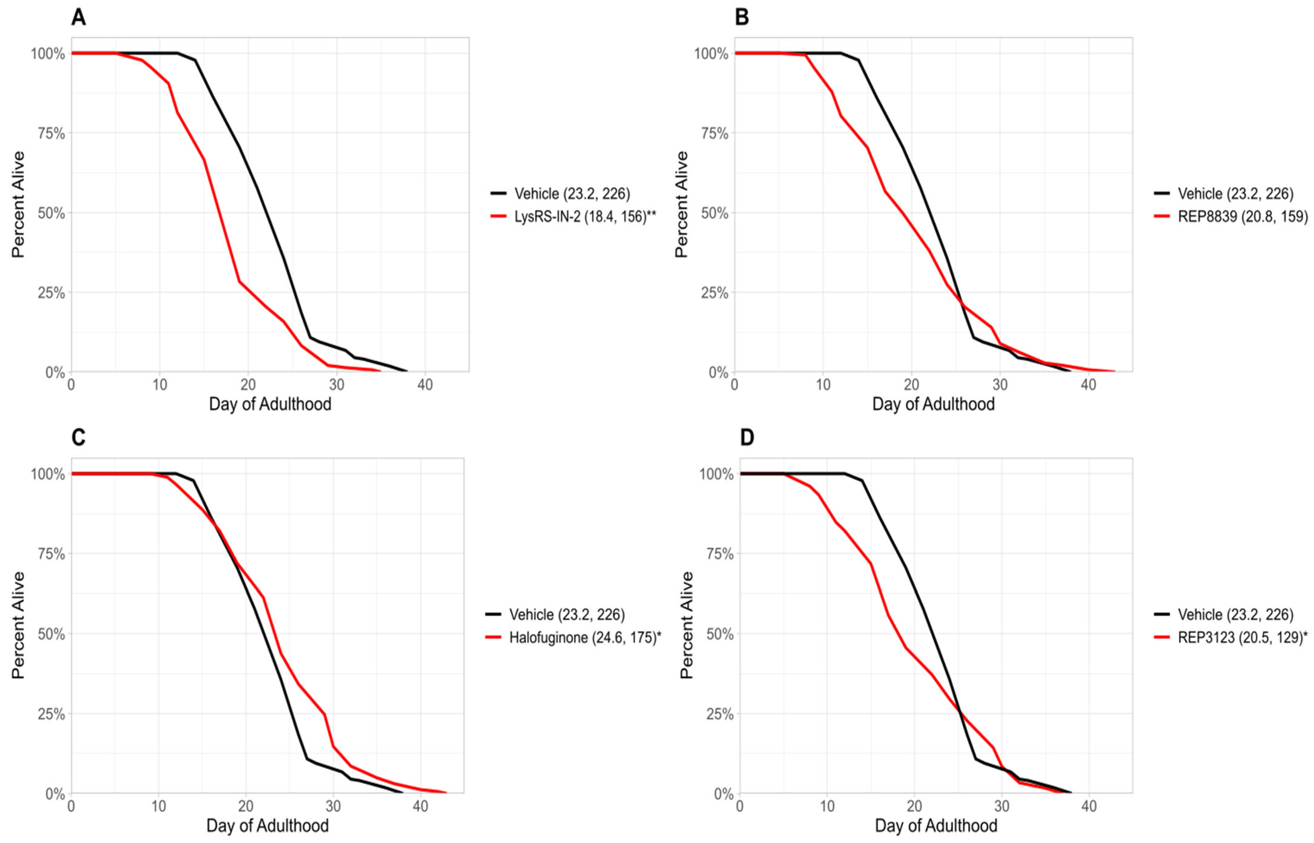 Two of the compounds identified in this study—REP3123 and REP8839—target methionyl tRNA synthetase, while LysRS-In-2 and halofuginone inhibit lysyl and prolyl-tRNA synthetases, respectively. All four significantly increase lifespan in wild-type