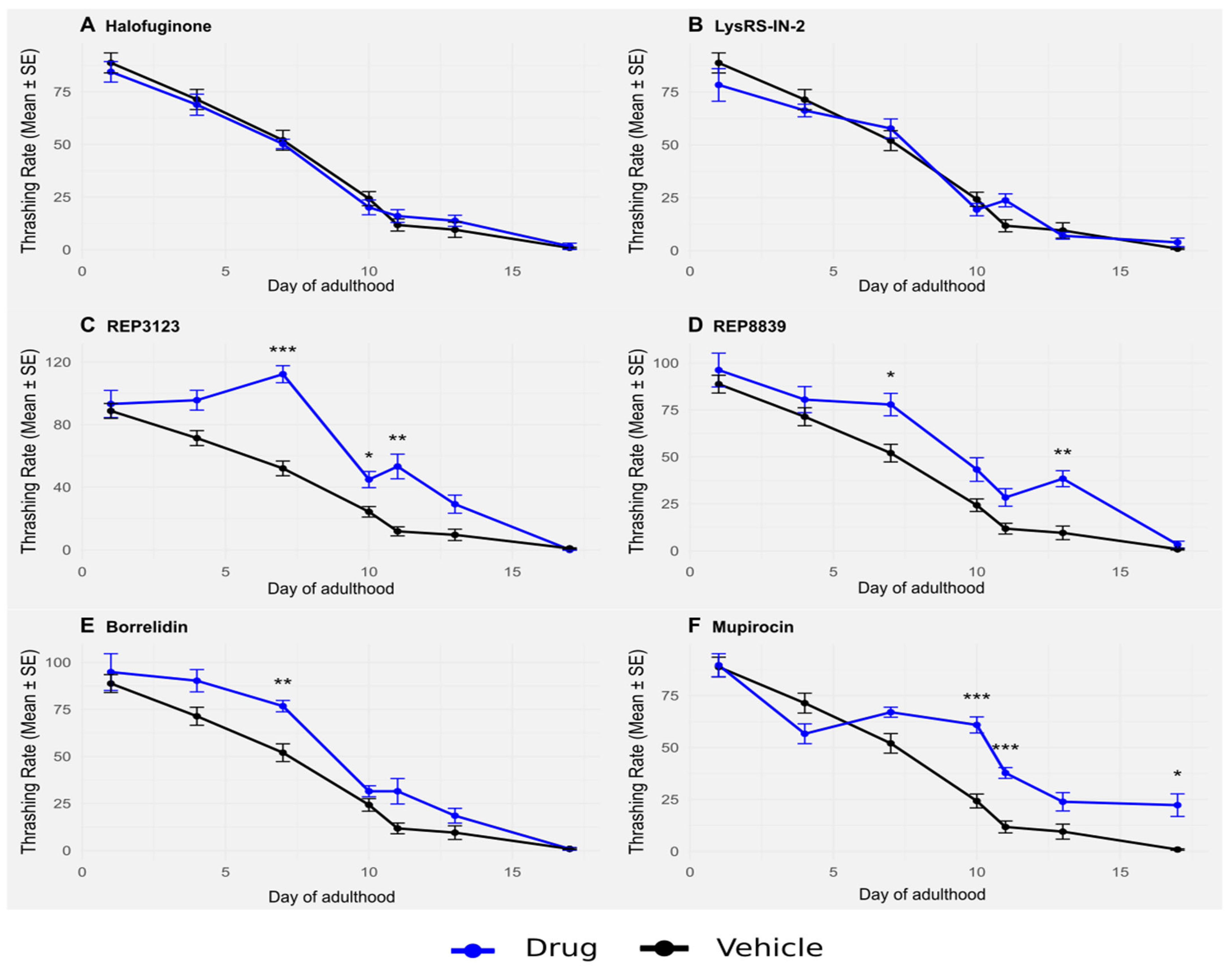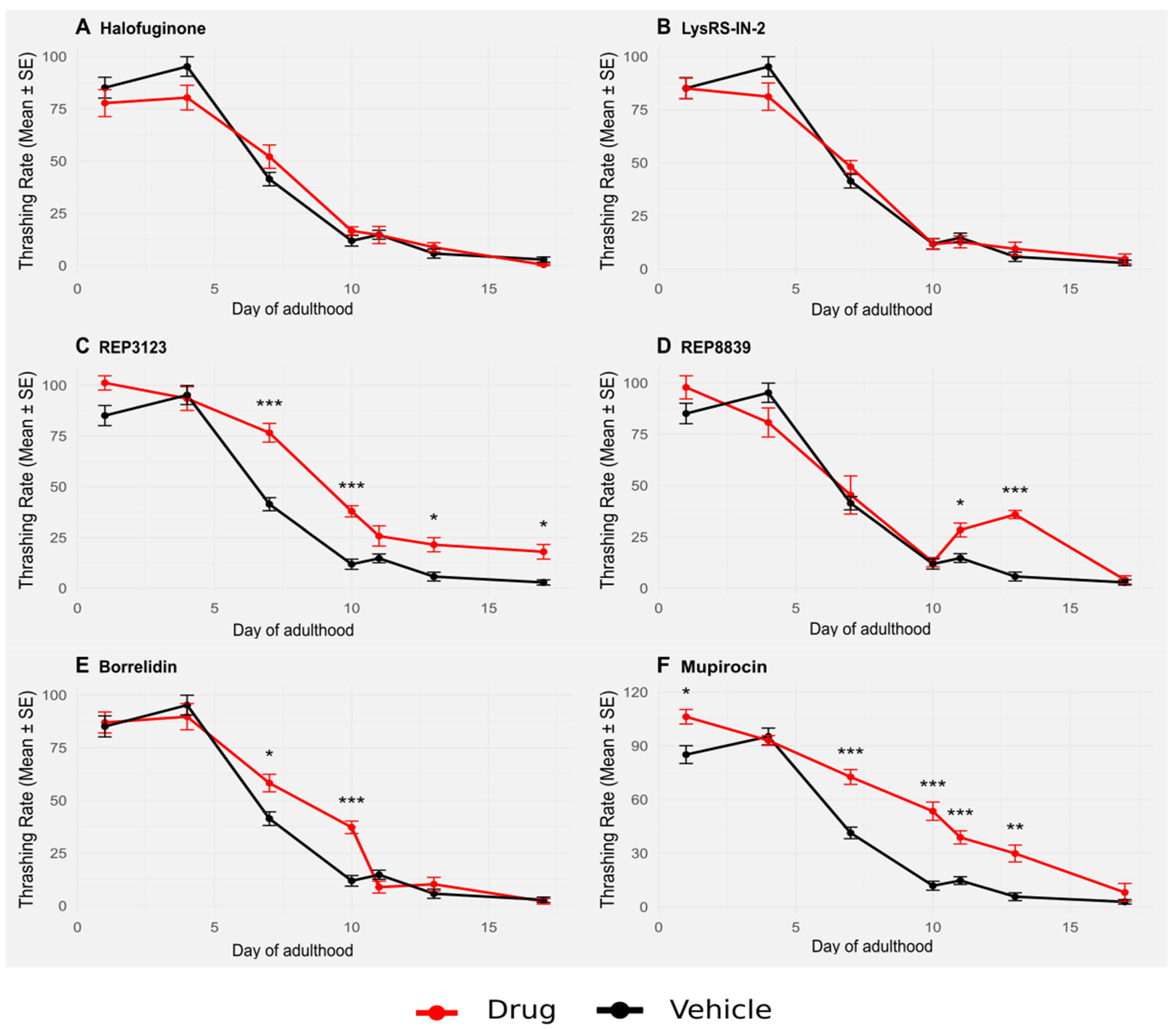 Beyond lifespan, we also assessed healthspan through age-related declines in motility using the thrashing assay. Treatment with some tRNA synthetase inhibitors resulted in a sustained increase in thrashing behavior throughout aging, suggesting improved overall vitality in later life (