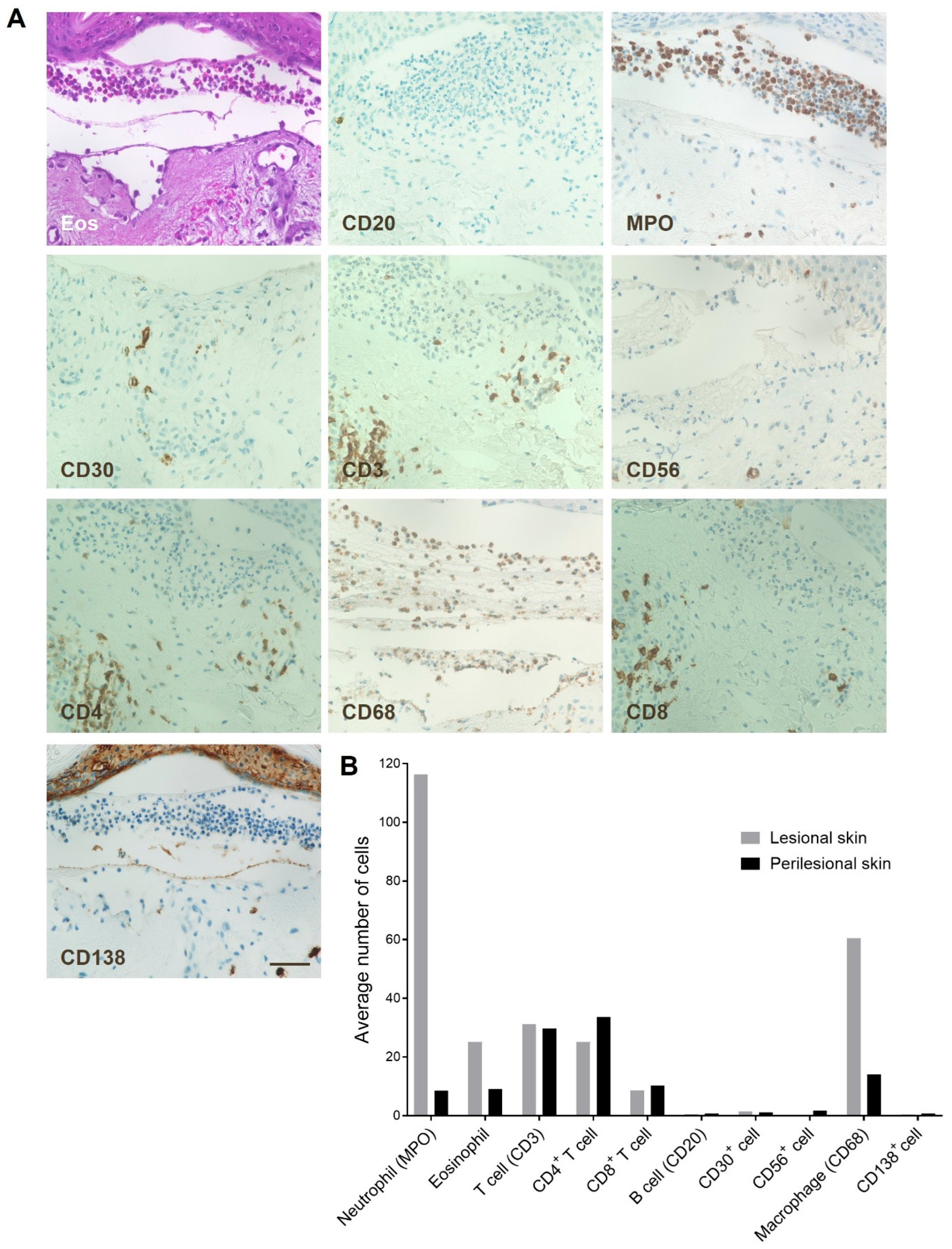 3.1. Neutrophils Predominate Among Inflammatory Infiltrates in Anti-p200 Pemphigoid Skin