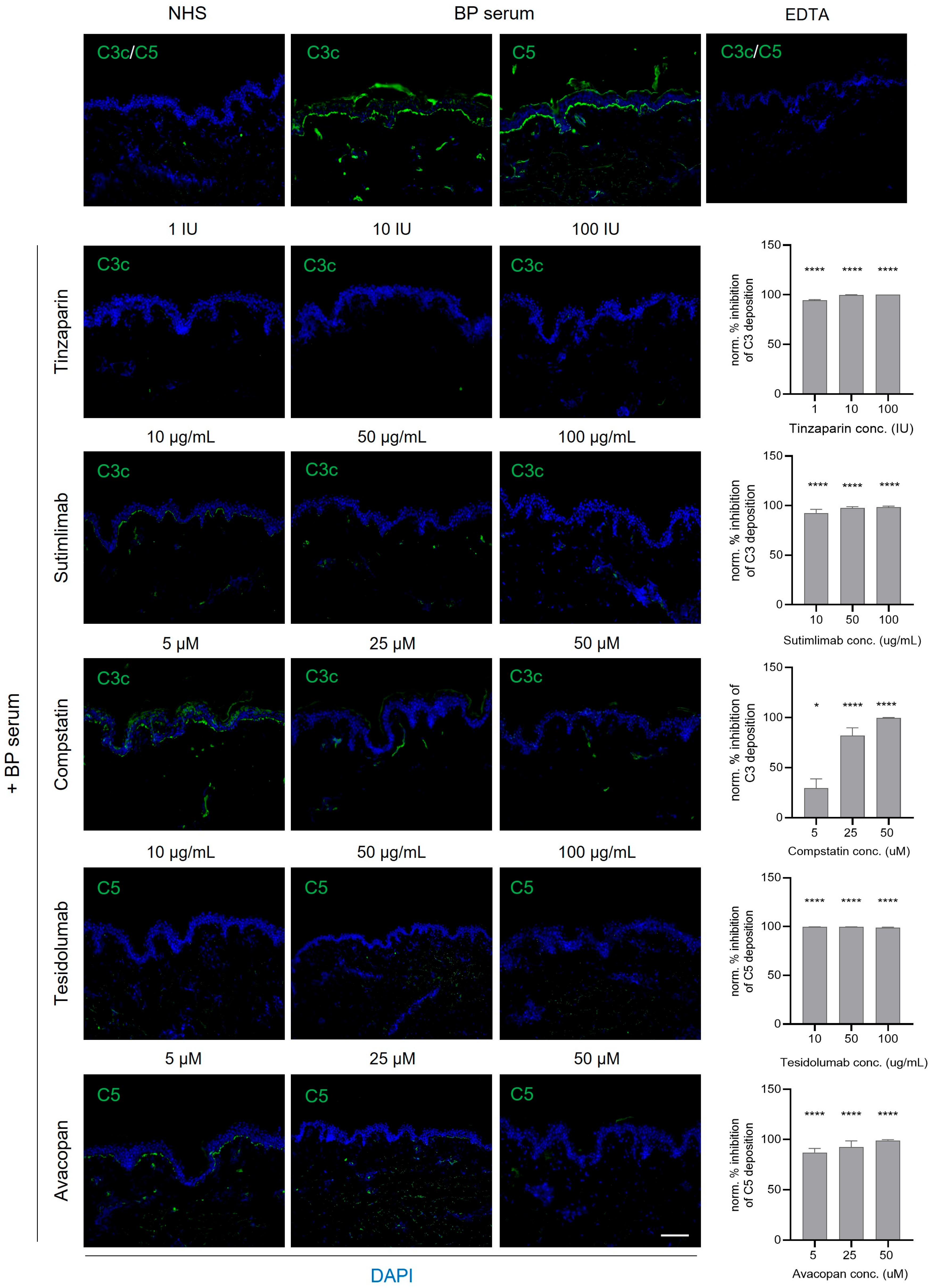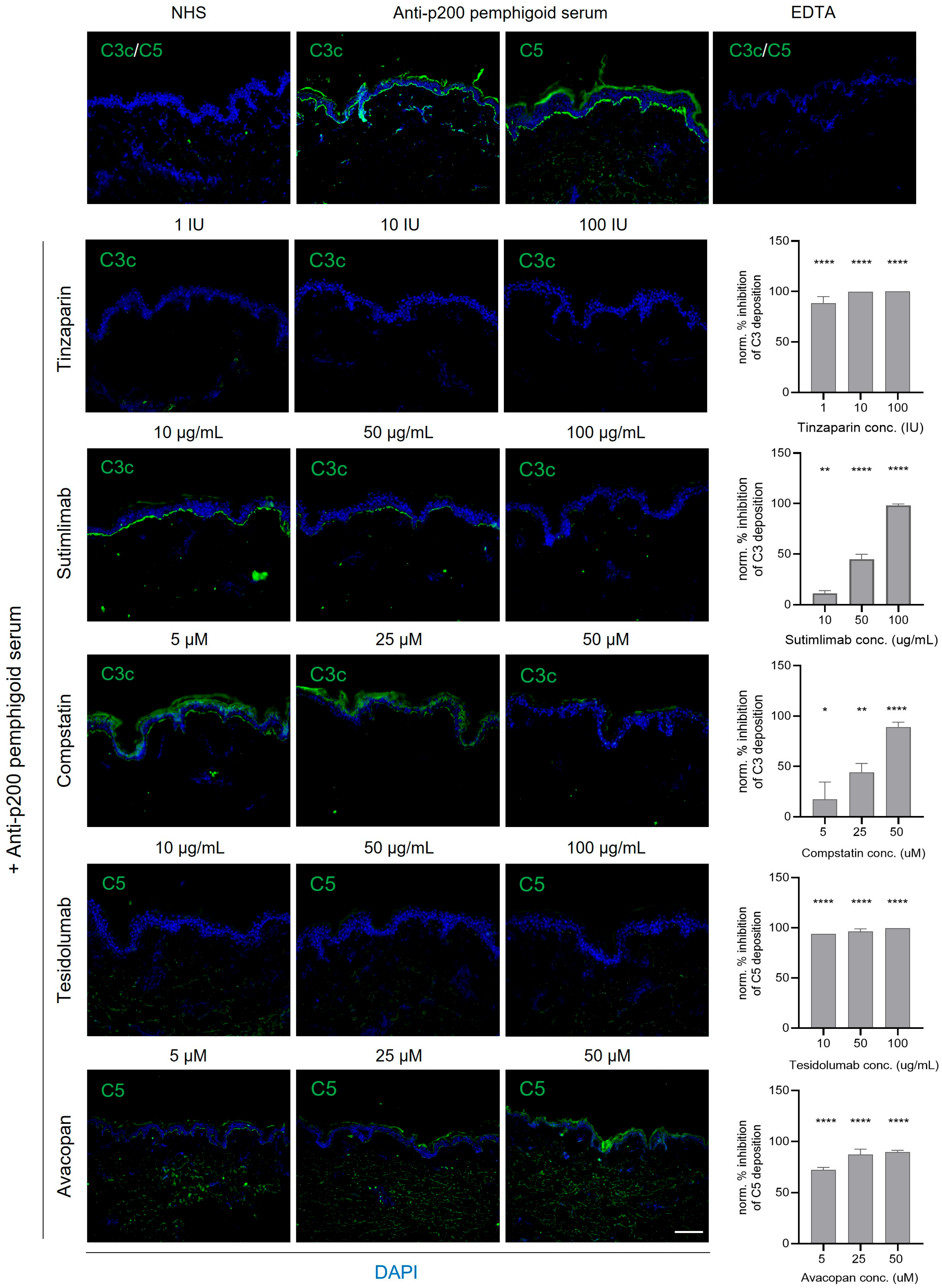 - Freire, P.C.; Munoz, C.H.; Derhaschnig, U.; Schoergenhofer, C.; Firbas, C.; Parry, G.C.; Panicker, S.; Gilbert, J.C.; Stingl, G.; Jilma, B.; et al. Specific Inhibition of the Classical Complement Pathway Prevents C3 Deposition Along the Dermal-Epidermal Junction in Bullous Pemphigoid. J. Investig. Dermatol. 2019, 139, 2417–2424.e2412. [Google Scholar] [CrossRef]