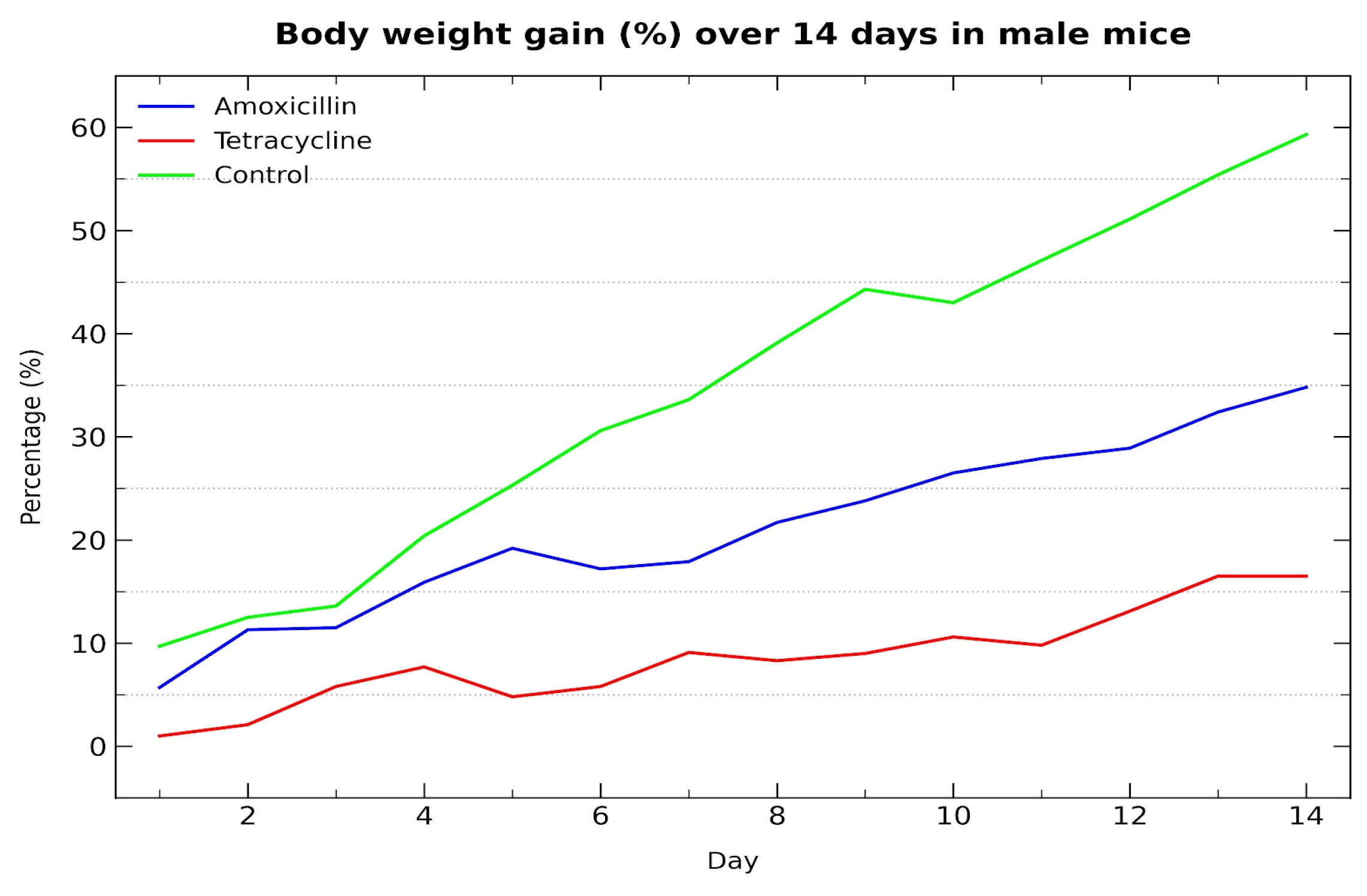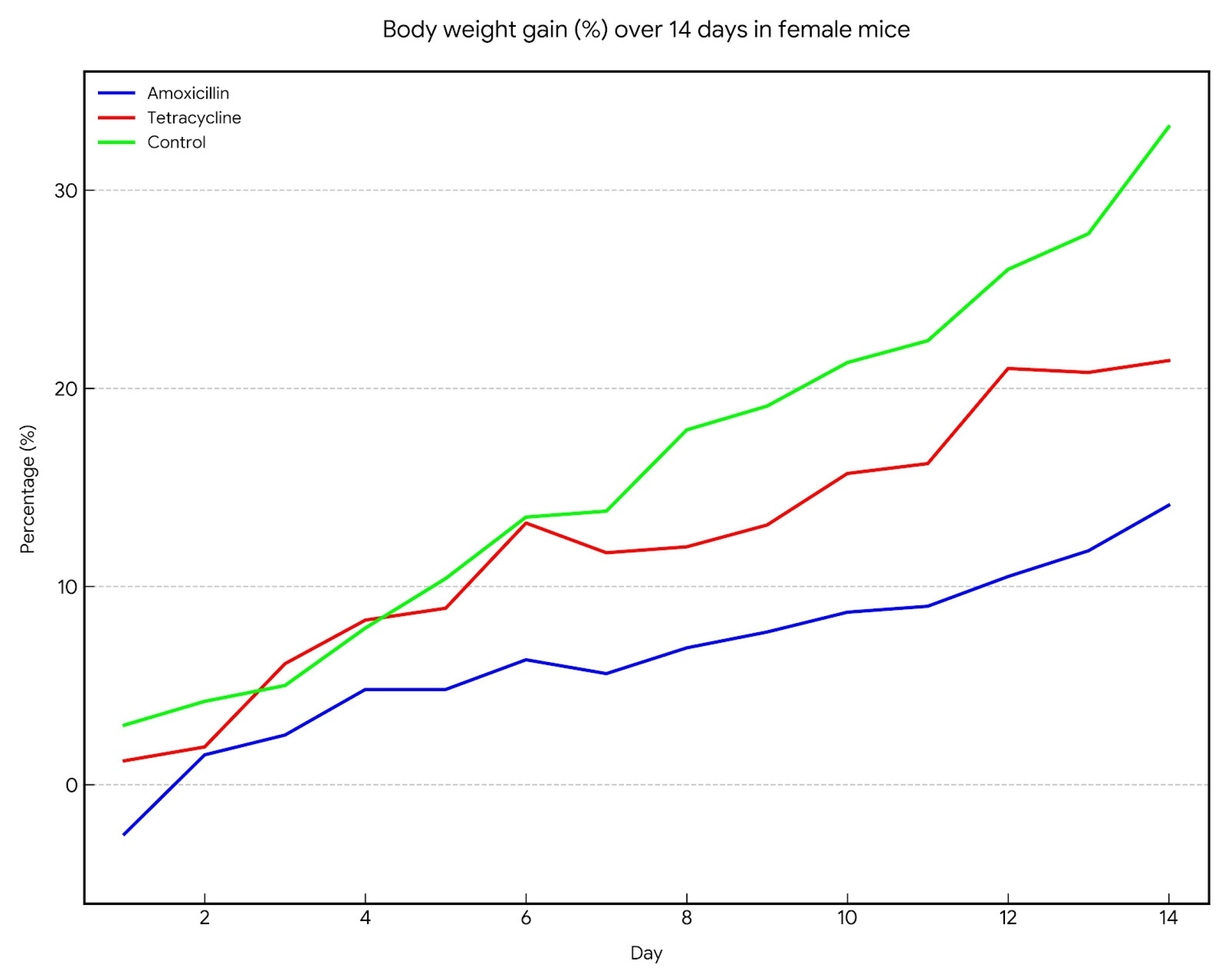 This graph (Figure 2) shows the percentage increase in body weight over a 14-day period in female mice. The control group gained the most weight, followed by tetracycline, while amoxicillin showed the lowest increase, indicating a stronger negative effect.