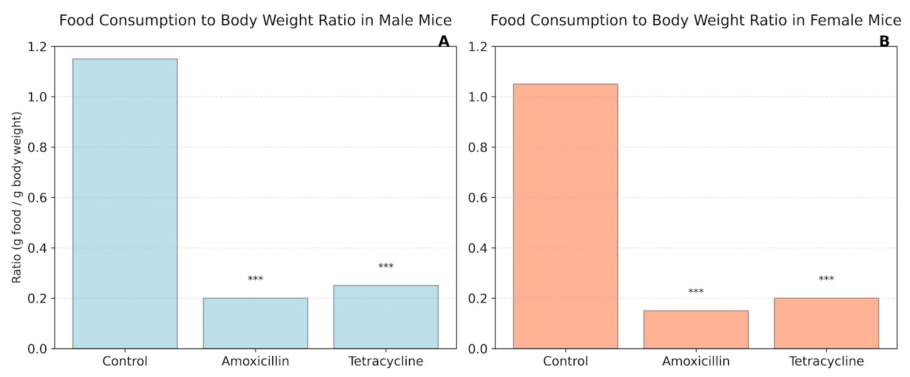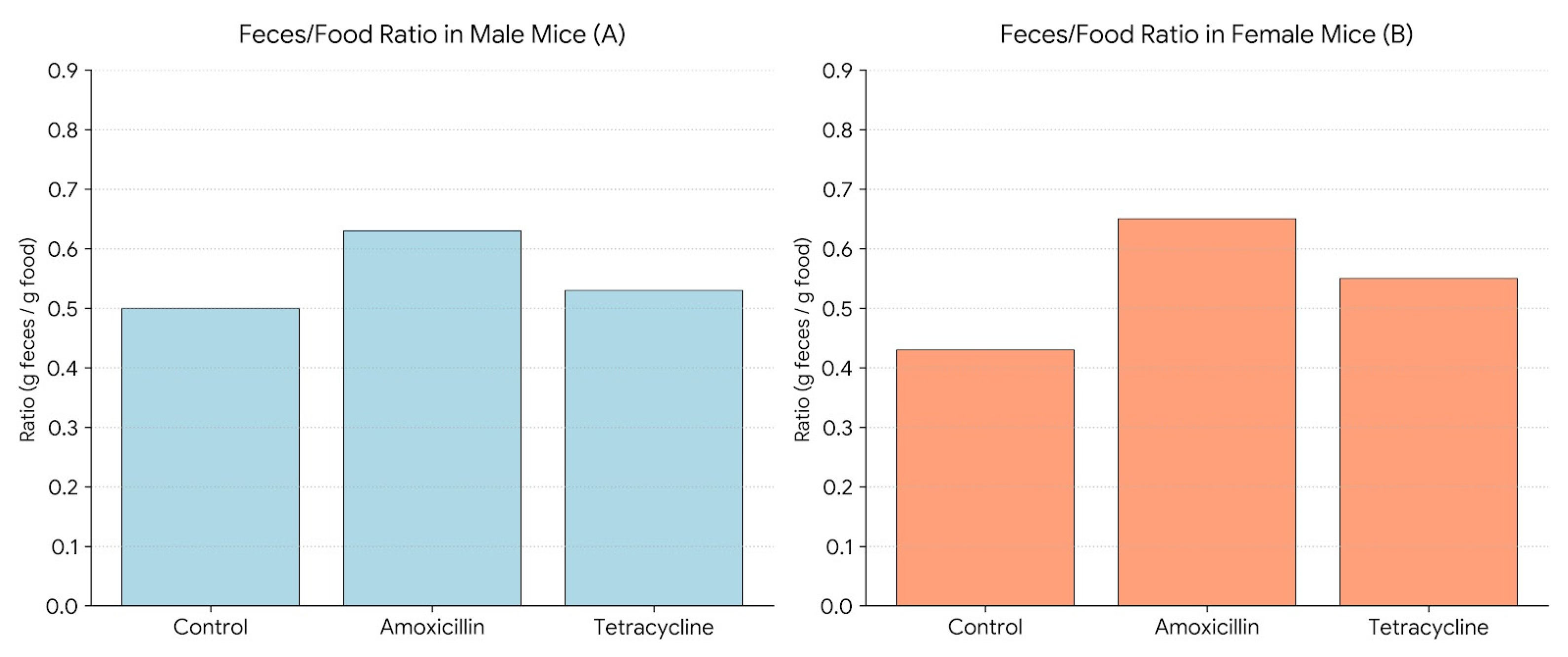 Figure 4 shows the average feces-to-food ratio (g feces/g food consumed) in male and female mice after treatment with amoxicillin or tetracycline. In males (A), amoxicillin significantly increased the ratio compared to the control, whereas tetracycline did not cause a significant change. In females (B), both antibiotics significantly elevated the feces-to-food ratio compared to the control. In females, no significant differences were observed between the two antibiotic groups.