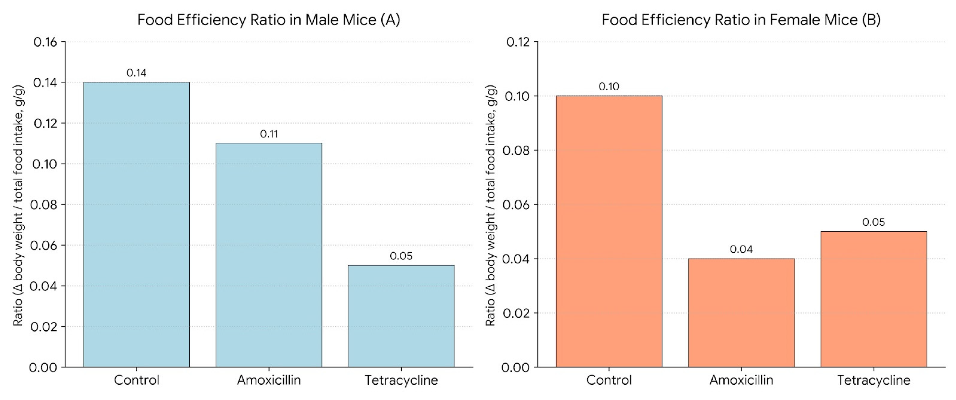 Figure 5 illustrates the Food Efficiency Ratio (FER) in male (A) and female (B) mice. FER was calculated as the change in body weight divided by the total food intake over a 14-day period (Δ body weight/total food intake, g/g), providing a measure of how efficiently each group converted food into body mass. Antibiotic treatment reduced FER. As the graph shows in males, amoxicillin (0.11) and tetracycline (0.05) lowered efficiency compared to the control (0.14). In females, amoxicillin caused a sharp decline (0.04) from control (0.10), with tetracycline (0.05) showing slight improvement but still below control. These findings suggest antibiotics impair food efficiency, with a more pronounced effect in females, possibly due to sex-specific metabolic or microbiome differences.
