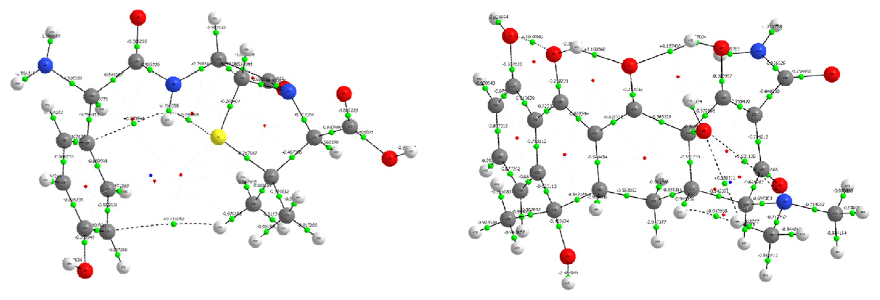 Intramolecular Hydrogen Bonding and Electrostatic Interactions: Several weak interactions were identified that resemble intramolecular hydrogen bonds. In amoxicillin, BCPs such as S1–H35 (ρ = 0.015 a.u., ∇2ρ = +0.050 a.u., H = −0.009 a.u.) and O6–H44 (ρ = 0.367 a.u., ∇2ρ = +2.623 a.u., H = −0.790 a.u.) suggest both weak and moderately strong hydrogen bonding [41]. These are essential in stabilizing the bioactive conformations of the drug. In tetracycline, similar behavior is observed: BCPs like O5–H51 (ρ = 0.335 a.u., ∇2ρ = +2.389 a.u.) and O7–H56 (ρ = 0.367 a.u., ∇2ρ = +2.627 a.u.) represent strong hydrogen bonding typical of hydroxyl and enolic functionalities, stabilizing the polycyclic skeleton through intramolecular H-bond networks. Their high G/|V| ratios and negative total energy densities confirm a mixed electrostatic-covalent character, especially relevant to the molecule’s acid-base behavior and solvation.