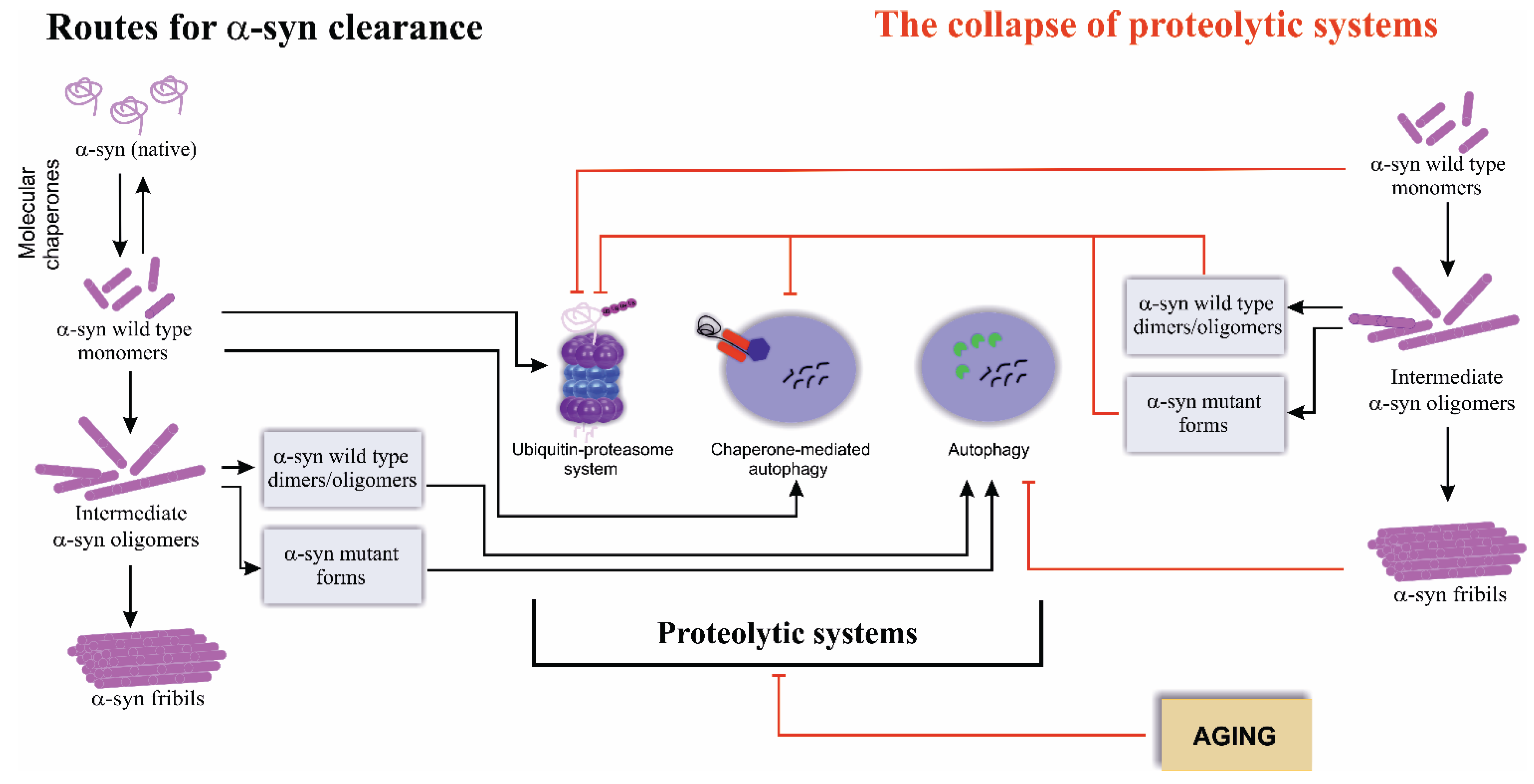 The successive failure of protein degradation pathways, as a cause or consequence of α-syn toxic species provides a key step in the pathological cascade that leads to neurodegeneration. Aging, a key player on neurodegeneration, precipitates the dysfunction of the protein degradative systems and mitochondria, being a crucial factor that might trigger the beginning of the cellular collapse. Understanding the crosstalk between the proteolytic systems, mitochondrial dysfunction and aging in synucleinopathies, as well as how modulation of these molecular pathways can improve or revert the course of disease, might be a good strategy to fight against the detrimental effects promoted by α-syn.
