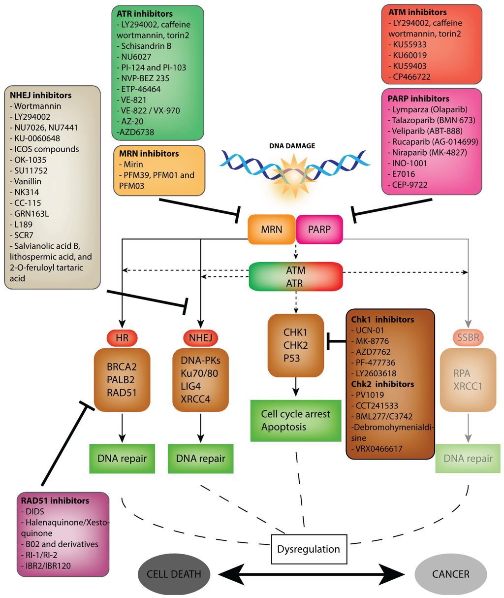 To respond to DNA damage, cells have implemented the DNA Damage Response. DDR is a signal transduction pathway that implicates different actors depending on the type of damage and/or the cell cycle phase. Firstly, the damage is detected by sensor proteins such as MRN (MRE11-RAD50-NSB1) or PARP1 (Poly(ADP-ribose) Polymerase 1). These sensors recruit the apical kinases Ataxia telangiectasia mutated (ATM) or Rad3-related (ATR). The signal is further amplified and the response results in repair (following diverse mechanisms), cell cycle arrest and/or apoptosis. Single-strand breaks are repaired by Single-Strand Break Repair (SSBR—not discussed in this review). Double-strand breaks are repaired by two main mechanisms: Homologous Recombination (HR) and Non-Homologous End-Joining (NHEJ). HR involves mediators such as BRCA2, RAD51 and PALB2. NHEJ brings into play proteins such as DNA-dependent protein kinase catalytic subunit (DNA-PKcs), Ku70/80, Ligase IV and XRCC4. During DDR pathway, cells require effectors, activated by ATM and ATR, such as CHeckpoint Kinase 1 (CHK1), Checkpoint Kinase 2 (CHK2) or p53 to arrest the cell cycle or enter in apoptosis. A dysregulation of these processes can lead to cell death or, more seriously, to mutagenesis and cancer. When cancer does occur, targeting the principal DDR actors allows the promotion of cell death in order to limit cancer progression. Specifics inhibitors have been designed to target different actors of the DDR pathway. Major inhibitors, discussed in this review, are represented in different boxes in this figure.