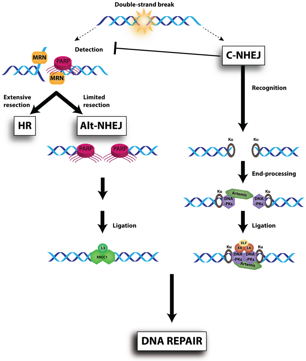 All living organisms can suffer from deleterious attacks from extrinsic agents as well as intrinsic sources such as reactive oxygen species. One of the most harmful lesions found in genomic DNA are double-strand breaks (DSBs), whose massive cytotoxicity is the basis for conventional DSB-inducing agents, such as ionizing radiation (IR), radiomimetic drugs and topoisomerase II inhibitors, currently used as treatment of choice for cancer therapy. Unfortunately, such treatments come with a lack of tumour specificity, resulting in severe side effects that negatively impact on patient’s life. Current research efforts are now directed toward identifying small inhibitory molecules targeting specific pathways involved in signalling and repairing DSBs. These pathways collectively form a complex network, termed the DNA damage response (DDR), evolved to neutralize DNA lesions and prevent transmission of incorrect genetic information to daughter cells during cell division. In normal cells, the DDR can coordinate cell cycle arrest, DNA repair and apoptosis, and consists of three classes of proteins, each exerting critical functions. Sensors detect the presence of DNA lesions, signal transducers generate and amplify the DNA damage signal, and effectors induce DNA repair, cell cycle delay, programmed cell death or senescence (for review see [,]). Cancer cells, for a large part, have compromised DDR pathways, some of them being dependent on a sole back-up pathway for survival. The use of inhibitors against essential components of a back-up pathway, in a synthetic lethal approach, is a promising avenue to specifically eradicate cancer cells. Another inhibitor-based approach to therapy is the potentiation of the effects of DNA-damaging anti-cancer agents, particularly in instances of therapeutic resistance. This review aims to provide a comprehensive view of key inhibitors of DSB DNA damage signalling and repair proteins (outlined in Figure 1).