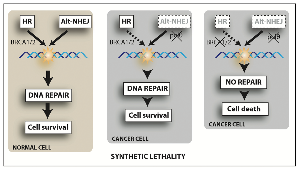 The BRCA1 and BRCA2 genes code for proteins that have been very well documented for being key for a functional HR repair pathway. Normal cells of BRCA1/2 mutation carriers have one copy of BRCA1 or BRCA2 (BRCA1/2+/−), which allows them to retain their capability to undergo repair with satisfactory proficiency. However, when the wild-type BRCA is lost, these cells become defective in repairing DSBs by HR. Instead, these lesions are repaired by the error-prone mechanisms of NHEJ leading to genomic instability and predisposition to cancer [,,]. Therefore, much of the development of PARP inhibitors has been focused on targeting this weakness of cancers associated with mutations in these breast cancer-related tumour suppressor genes. Accordingly, cells containing a mutation in either of these genes, when treated with PARPi will fail to undergo normal HR repair. This selective targeting of BRCA-deficient cancer cells by PARPi introduces the concept of synthetic lethality, whereby a cell harbouring one of two gene or protein defects is viable while a cell containing both defects is nonviable. Moreover, PARP has been suggested to participate in the restoration of stalled replication forks [,] by accumulating at the damaged site and recruiting MRE11 to catalyse DNA-end processing. Therefore by inhibiting PARP, stalled replication forks will not progress and the consequent accumulation of toxic DNA structures will lead to cytotoxicity in HR-deficient cells [].