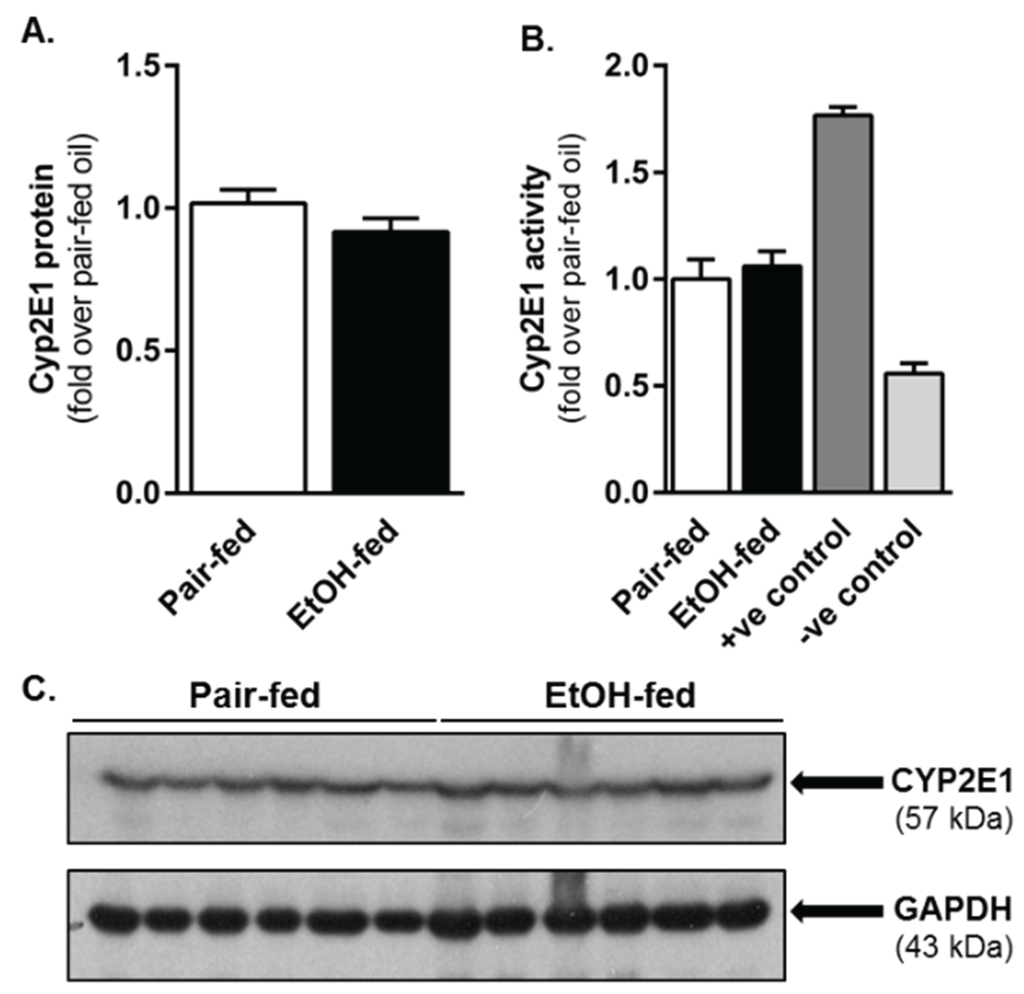 Hepatic CYP2E1 content and activity did not differ between control (pair-fed) or ethanol-fed mice. Mice were allowed free-access to a 2% (v/v) ethanol-containing Lieber-DiCarli diet, or pair-fed a control diet, for 10 days. Livers were harvested, a portion of which was used for performing a CYP2E1 immunoblot (A,C) while a separate portion was used to perform a CYP2E1 activity assay (B). In (B), the positive (+ve) control was generated by using microsomes isolated from mice fed a 5% (v/v) ethanol-containing diet for four weeks. The negative (−ve) control was generated by using microsomes isolated from mice 24 h after a single CCl4 exposure (CCl4 consumptively depletes CYP2E1). N = 4–8 mice per group.