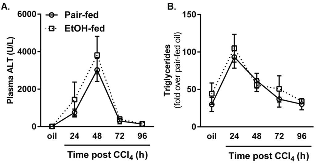 CCl4 induced robust liver injury, as determined by measuring plasma alanine aminotransferase (ALT) activities, which was greatest 48 h after hepatotoxicant exposure and subsided thereafter; importantly, there was no difference in plasma ALT activities between groups (Figure 2A). These data parallel those found by others using the same ethanol-feeding paradigm [8,10]. Likewise, hepatic steatosis, as determined by a biochemical assay for triglyceride, increased 24 h after CCl4 and was reduced thereafter without a difference between pair- or ethanol-fed groups at any time point (Figure 2B). Taken together, these data suggest that moderate ethanol does not alter CCl4-induced liver injury or steatosis. Thus, this model provides a way to evaluate the impact of ethanol on hepatic wound healing independent of differences in the severity of CCl4-induced, necrotic liver injury.
