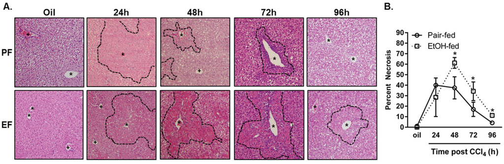 Moderate ethanol feeding delayed removal of nectrotic tissue after CCl4 exposure. Mice were allowed free-access to a 2% (v/v) ethanol containing diet for 2 days and then were exposed to CCl4 and euthanized 24, 48, 72 or 96 h thereafter while remaining on the ethanol diet. Control animals were pair-fed a diet that isocalorically substituted maltose dextrins for ethanol. (A) Representative micrographs taken of hematoxylin and eosin stained liver sections taken at the time points indicated. The dashed line demarks boundary of injured (24 h) or necrotic hepatocytes (48, 72, 96 h). PF = pair-fed, EF = ethanol-fed, asterisk = central vein, plus sign = portal vein; (B) Percent necrotic area graphed over time post CCl4 in pair- and ethanol-fed mice. N = 4–8 mice per group.