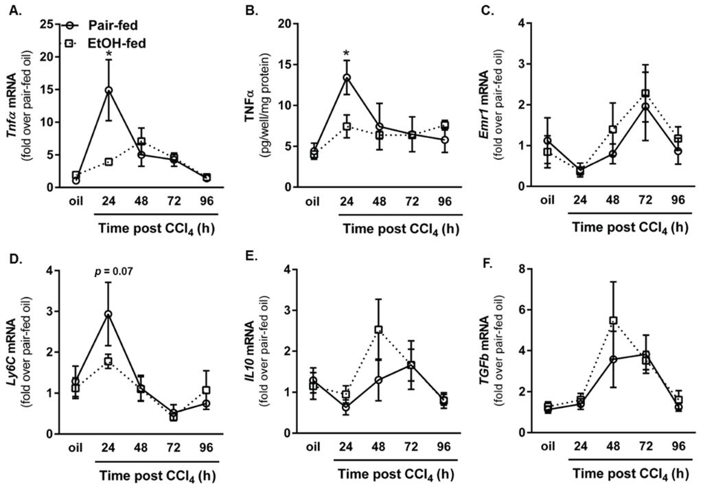 Because macrophages are major producers of TNFα, we measured hepatic accumulation of Emr1 (gene encoding F4/80, a mouse macrophage marker [31]) and Ly6C, a marker associated with inflammatory/M1 macrophages recruited to the liver after injury [31,32]. While Emr1 transcripts were reduced 24 h after CCl4 exposure in both groups of mice, ethanol-feeding did not affect the level of this transcript (Figure 4C). By contrast, CCl4 increased hepatic accumulation of Ly6C transcripts in pair-fed mice, but not ethanol-fed mice, 24 h after CCl4 exposure; this approached statistical significance (Figure 4D, p = 0.07). These data suggested that moderate ethanol exposure may have shifted hepatic macrophage populations towards a wound healing/M2-like phenotype which could promote fibrogenesis [33,34]. To address this point, we measured accumulation of hepatic Il10 and Tgfβ transcripts. Moderate ethanol feeding did not alter hepatic Il10 or Tgfβ (Figure 4E,F). Future work is needed to delineate which macrophage subset is required for TNFα production in response to CCl4. Specifically, it is important to determine whether or not resident macrophages change their phenotype or if early macrophage recruitment is required for robust TNFα production after CCl4 in pair-fed mice. Analysis of other inflammatory cytokines or chemokines may provide additional insight on how moderate ethanol alters the hepatic microenvironment to shape wound healing after acute CCl4 exposure.