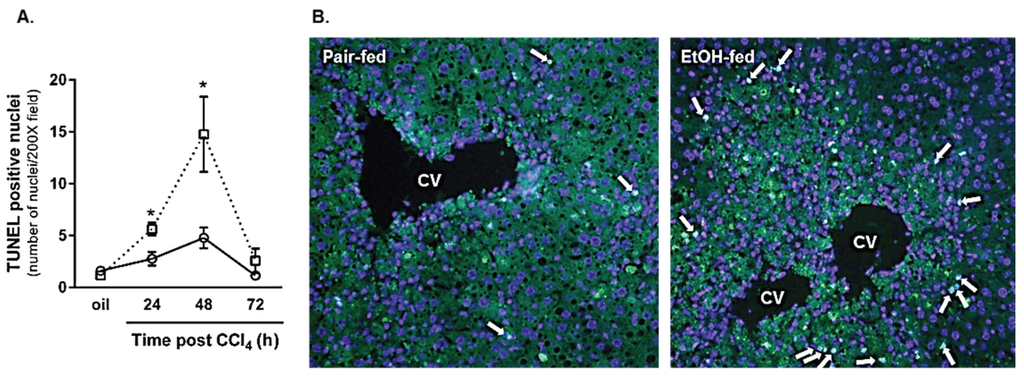 Hepatocyte apoptosis was increased in livers from ethanol-fed mice 24 and 48 h after CCl4 exposure. The terminal deoxynucleotidyl transferase dUTP nick end labeling (TUNEL) assay was used to determine the number of apoptotic hepatocyte nuclei in livers from pair- and ethanol-fed mice 24, 48, and 72 h after CCl4 exposure. (A) Quantification of the number of TUNEL-positive hepatocyte nuclei in each 200× image (three non-overlapping images per animal); (B) Representative TUNEL staining from pair- and ethanol-fed mice 48 h (maximum hepatocyte apoptosis) after CCl4 exposure. N = 4 mice per group. * p < 0.05.