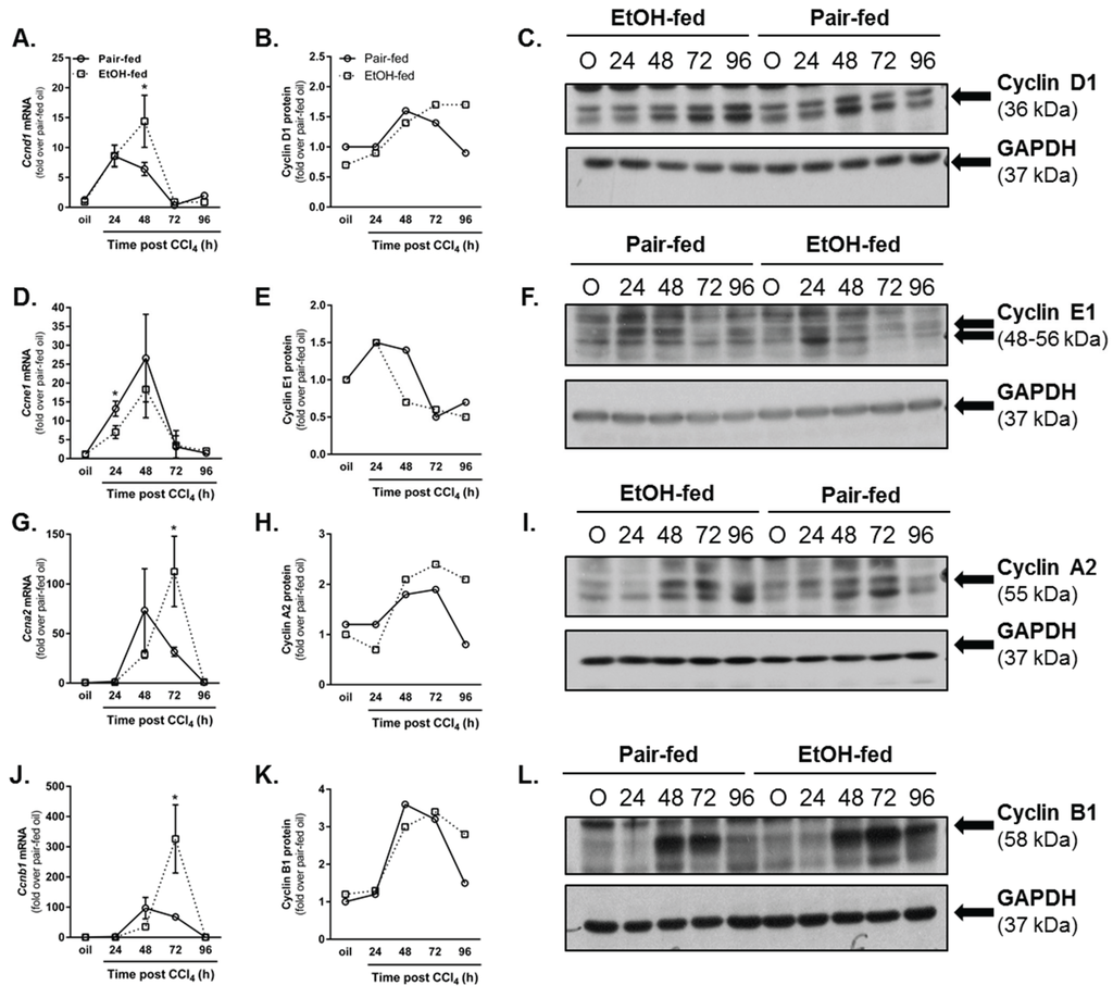 Cyclin A2 peaks during the G2 phase of the cell cycle and is important for transition to mitosis [41,42]. Hepatic cyclin A2 transcript accumulation occurs in pair- and ethanol-fed mice. However, in contrast to pair-fed mice, ethanol-fed mice exhibited 3.5-fold higher cyclin A2 transcripts 72 h after CCl4 exposure (Figure 6G). Consistently, Cyclin A2 protein levels were more than twofold greater in livers from ethanol-fed mice 96 h after CCl4 exposure (Figure 6H,I). Cyclin B1 peaks at the G2-M phase transition [43]. At the mRNA level, cyclin B1 peaks in livers from pair-fed mice 48 h after CCl4, but this peak is delayed until 72 h after CCl4 and greater in livers from ethanol-fed mice (Figure 6J). At the protein level, the increase in cyclin B1 mRNA manifested in a 2.5-fold increase in cyclin B1 protein at 96 h after CCl4 (Figure 6K,L). Taken together, the cyclin data in Figure 6 suggest that moderate ethanol feeding did not impair hepatocyte entry into the cell cycle, but prolonged the cell cycle in liver after acute CCl4 exposure.