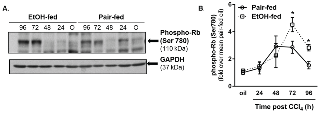 Phosphorylation of the retinoblastoma (Rb) protein was increased by moderate ethanol feeding to mice. Mice on ethanol-containing diets were exposed to CCl4 and euthanized 24–96 h later. Immunoblots were used to determine hepatic content of phospho-Rb (Ser780) in livers from each mouse. (A) Representative phospho-Rb immunoblot. GAPDH was used as a loading control; (B) Semi-quantification of band densities from all blots after normalization to GAPDH. Data are graphed as fold change over pair-fed, olive oil-treated mice. N = 4–8 mice per group. * p < 0.05.