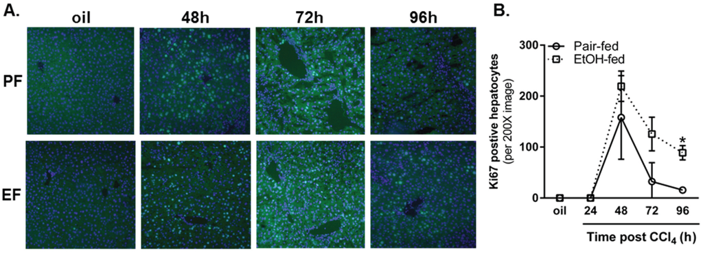 Moderate ethanol feeding to mice sustained hepatocyte proliferation late in the time course after CCl4 exposure. (A) Representative images from Ki67-stained livers from pair- and ethanol-fed mice by immunofluorescense (green) after CCl4. DAPI (blue) was used as a nuclear counterstain. Sections were stained on the same day and exposure times kept constant for each image; (B) Quantification of the number of Ki67-positive hepatocyte nuclei in 3–4 images from a single liver section per mouse. PF = Pair-fed, EF = Ethanol-fed. N = 3–4 mice per group. * p < 0.05.