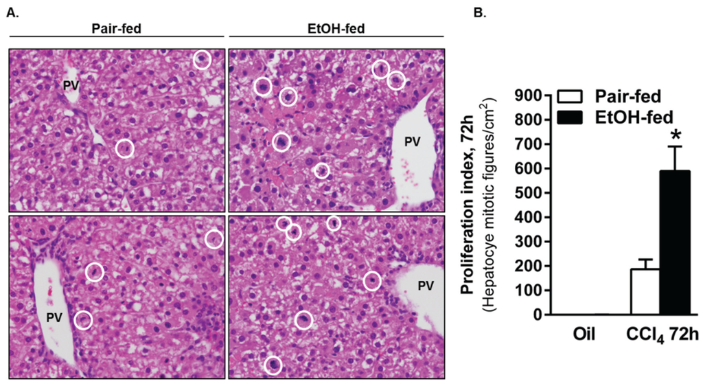 The number of mitotic figures was greater in livers from ethanol-fed mice 72 h after CCl4 exposure. (A) Representative images from H&E stained liver sections taken from mice 72 h after CCl4 exposure. Mitotic figures were found predominantly in Zones 1 and 2, so the images were captured using the portal vein as a landmark. The white circles in each image outline mitotic cells. (B) Graphical representation of the number of mitotic cells in livers from pair and ethanol-fed mice 72 h after CCl4 exposure. Mitotic figures were rare or not present at other time points evaluated. N = 4–8 mice per group. * p < 0.05.