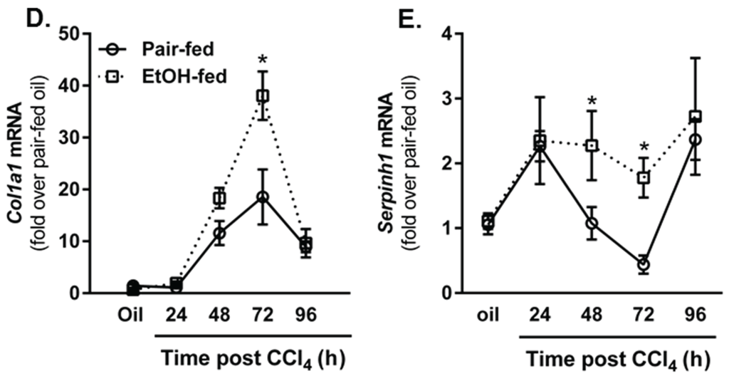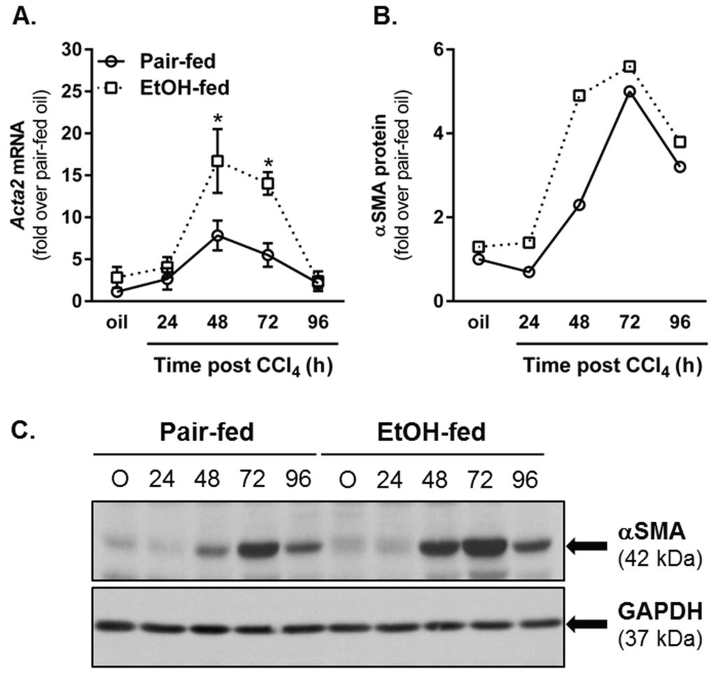 The later stages of wound healing after tissue injury involve activation of resident fibroblast populations, production of extracellular matrix and matrix remodeling [4]. After liver injury induced by CCl4, hepatic stellate cells (HSC) are activated and transdifferentiate into matrix-synthesizing myofibroblasts [50]. HSC upregulate their expression of Acta2, the gene which encodes for α smooth muscle actin (αSMA), produce collagen and increase their expression of the collagen specific chaperone, heat shock protein (hsp)47 [50,51]. To determine whether or not moderate ethanol feeding to mice enhanced indices of HSC activation in our hands, we quantified Acta2 transcript and protein accumulation in livers from pair- and ethanol-fed mice. At 48 and 72 h after CCl4 exposure, hepatic αSMA was increased at the mRNA level in livers from both pair- and ethanol-fed mice, but was threefold greater in livers from ethanol-fed mice (Figure 10A). At the protein level, immunoblotting revealed a twofold increase in αSMA protein 48 h after CCl4 in livers from ethanol-fed mice; no differences between diet groups were observed at any other time point (Figure 10B,C). Consistently, hepatic transcripts for type I collagen (Col1a1) and Serpinh1 (the gene which encodes the hsp47 protein) were also increased by CCl4 exposure in both diet groups, but were increased further in livers harvested from ethanol-fed mice 72 h (Col1a1) or 48 and 72 h (Serpinh1) after CCl4 exposure. Therefore, similar to published work [8,10], CCl4-induced HSC activation and induction of markers associated with fibrogenesis were increased by moderate ethanol exposure relative to those increases observed in pair-fed mice.