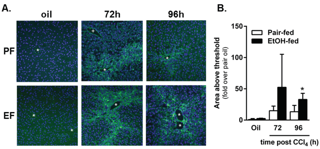 Matrix metabolism was sustained by ethanol feeding to mice after acute CCl4 exposure. In situ zymography was used to determine area of gelatinase activity in frozen liver sections from pair- and ethanol-fed mice after CCl4 exposure. (A) Representative fluorescence microscopy images. The green fluorescence indicates area of gelatinase activity. The blue fluorescence (DAPI) was used as a nuclear counter stain. The asterisks denote location of central veins, while the plus sign (PF, 72 h only) denotes the location of a portal vein. Matrix metabolism occurs most robustly in the pericentral area where CCl4-induced liver injury and subsequent liver regeneration occurs; (B) Quantification of the area of fluorescence per 200× image as a fold change over pair-fed, olive oil-treated mice. PF = Pair-fed, EF = Ethanol-fed. N = 3–6 mice per group (CCl4). * (in B), p < 0.05.