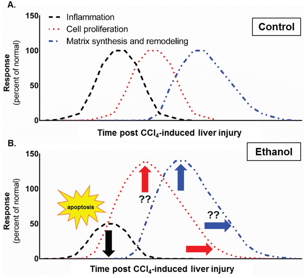 Effect of moderate ethanol feeding to mice on the liver wound healing response after acute hepatotoxin exposure. In (A), three phases of wound healing, inflammation (black dotted line), cell proliferation (red dotted line) and HSC activation, matrix synthesis and remodeling (blue dotted line) are depicted as overlapping curves which peak at 100% of normal response after acute CCl4; In (B), the effect of moderate ethanol on these three phases of wound healing after acute CCl4 exposure are depicted. The arrows added to the graph indicate that ethanol decreased (black downward arrow), prolonged (red right arrow) or enhanced (blue upward arrow) the related phase of the wound healing response. In brief, the data contained in this study demonstrated that early after CCl4-induced acute liver injury, inflammation is reduced in ethanol-fed mice relative to pair-fed mice. Reduced inflammation was associated with increased hepatocyte apoptosis (yellow “apoptosis” star), which occurred in parallel with a prolonged hepatocyte proliferative response. Moreover, indices of HSC activation were enhanced (peak values greater) in ethanol-fed mice. Finally, matrix degradation was prolonged in livers from ethanol-fed mice. Question marks indicate that more data is required to determine whether or not the ethanol-mediated effect, enhancement or prolongation, occurs in that phase of the wound healing response. We propose that reduction in TNFα, a surrogate marker for hepatoprotective inflammation, in ethanol-fed mice was responsible for increased apoptotic hepatocyte death and, therefore, the need for more robust hepatocyte proliferation, ECM synthesis and remodeling after CCl4-induced acute liver injury.