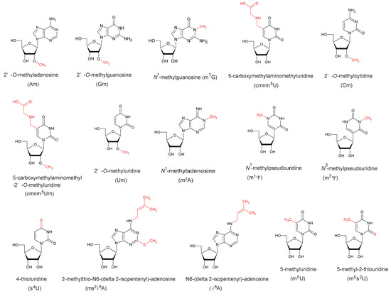 Structures and abbreviated names of the modified nucleosides described in this review. The modifications are colored in red.