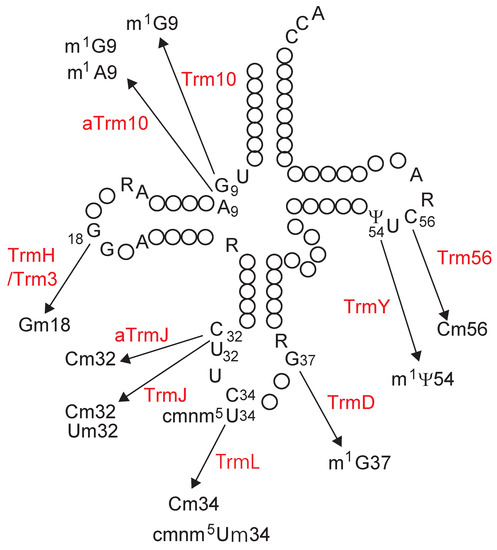 - Kempenaers, M.; Roovers, M.; Oudjama, Y.; Tkaczuk, K.L.; Bujnicki, J.M.; Droogmans, L. New archaeal methyltransferases forming 1-methyladenosine or 1-methyladenosine and 1-methylguanosine at position 9 of tRNA. Nucleic Acids Res. 2010, 38, 6533–6543. [Google Scholar] [CrossRef] [PubMed]