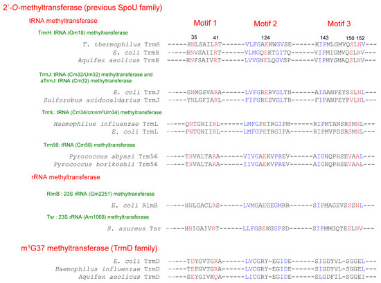 In 1996, Gustafsson et al. [2] compared the amino acid sequences of E. coli SpoU, S. azureus Tsr and yeast Pet56, which catalyzes methylation of the ribose of guanosine (G) at position 2270 in mitochondrial 21S rRNA to form 2’-O-methylguanosine (Gm2270) [6]. They reported that the three RNA 2’-O-methyltransferases have three conserved motifs, termed motifs 1, 2 and 3 (Figure 3) [2]. Almost simultaneously, analysis of an E. coli spoU gene deletion strain revealed that spoU encodes a tRNA (Gm18) methyltransferase [7], which catalyzes the transfer of a methyl group from S-adenosyl-l-methionine (AdoMet) to the 2’-OH of ribose of G18 in tRNA to produce Gm18 modification (Figure 1 and Figure 2) [8]. According to the nomenclature of tRNA methyltransferase genes, the gene name, spoU was subsequently altered to trmH (as the eighth identified gene for tRNA methylation in bacteria) [7] and spoU remains only in the name of the superfamily. In 2002, Anantharaman et al. reported that SpoU (TrmH) family members share amino acid sequence homologies with TrmD family members (Figure 3) [3]. TrmD catalyzes the formation of N1-methylguanosine at position 37 (m1G37) in tRNA (Figure 1 and Figure 2) [9]. Thus, although the SpoU (TrmH) and TrmD families were originally considered to be unrelated, this bioinformatics study suggested that they might share a common evolution origin and form a single superfamily [3].
