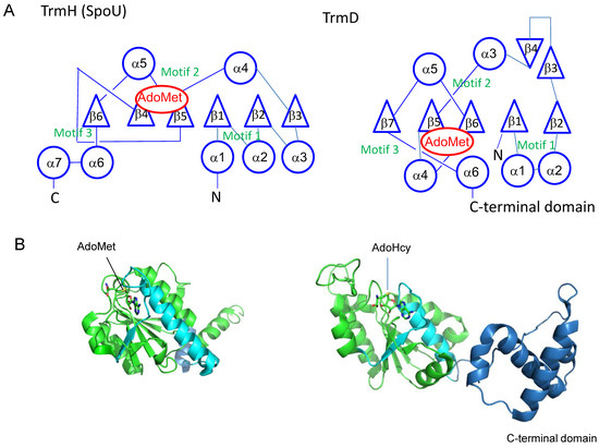 (A) Topological knot structures in TrmH (SpoU) and TrmD. The representations of topologies are in accordance with the references [10,15,19]. Circles, triangles and S-adenosyl-l-methionine (AdoMet) indicate α-helices, β-strands and AdoMet binding site, respectively. (B) Cartoon models of T. thermophilus TrmH (Protein Data Bank ID: 1v2x) and Escherichia coli TrmD (Protein Data Bank ID: 1p9p) subunits. To show the knot structures, the C-terminal regions of catalytic domains are colored in cyan. The C-terminal domain of E. coli TrmD is indicated in blue. The bound AdoMet and S-adenosyl-l-homocysteine (AdoHcy) are shown by stick models.