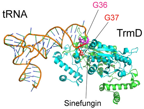 In 2015, the crystal structure of the TrmD-tRNA-sinefungin ternary complex was reported (Figure 7) [89]. Structural comparison with the TrmD-AdoMet and TrmD-sinefungin binary complexes revealed that tRNA binding causes movement of the C-terminal region. The N1-atom of G37 in the bound tRNA forms a hydrogen bond with Asp169 residue and Arg154 is located near the G37 base. Replacement of Asp169 and Arg154 of H. influenzae TrmD with Ala causes a loss of activity, suggesting that these residues are involved in the catalytic mechanism [89], consistent with the results of a previous site-directed mutagenesis study of E. coli TrmD [16]. Furthermore, the additional crystal structures of ternary complexes, in which G36 in tRNA was replaced by U and C, were solved and an interesting hypothetical model was proposed in which G36 recognition occurs after G37 recognition but before the methyltransfer reaction [89]. Together, these crystal structures and the site-directed mutagenesis studies explain the selection of tRNA by TrmD [89].