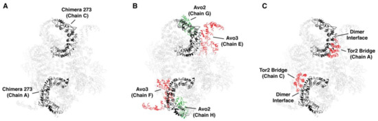 The Tor2 MAS domain of chimera 273 is involved in several quaternary interactions in TORC2. (A) Tor2 MAS (chimera 273) (black) mapped onto the cryo EM structure of TORC2 [30]. (B) Interactions between Tor2 MAS (black) and Avo2 (green) and Avo3 (red). (C) Interactions between Tor2 MAS (black) and Tor2 sequences (red) at the dimer interface. Protein chains are labeled according to nomenclature described in [30]. For clarity, the unstructured region between residues 869-914 in Tor2 in chimera 273 is not displayed.