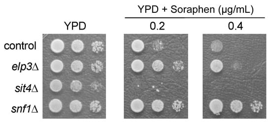 Soraphen A phenotype of elp3 mutants. Saccharomyces cerevisiae strains BY4741 (control) and its isogenic elp3, sit4 and snf1 mutants were grown to stationary phase and seeded at a concentration of 107, 106 or 105 cells/mL (from left to right) onto YPD medium plates containing the indicated soraphen A doses. Growth was recorded after three days. A representative result of three independent experiments is shown.