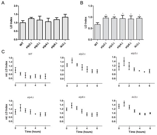 This result and the absence of rescue effects by pQKE on the soraphen A trait of sit4 (Figure 1C) suggest that this phenotype results from defects unrelated to the U34 modifications. However, the resistance of the elp3 mutant also suggested a possible role of the modification in regulation of the soraphen A target Acc1 and potentially, in lipid biogenesis or dynamics in general. Soraphen A resistance of the elp3 mutant was comparable to the snf1 mutant (Figure 2), lacking negative regulation of Acc1 activity by phosphorylation [2], potentially indicating a relevant effect of the Elongator dependent tRNA modification on lipid metabolism. To further investigate whether Elongator dependent tRNA modification may influence dynamic changes in LD content, we analyzed LD levels in mutants lacking different Elongator subunits in comparison to the wild type. We scored lipolysis after re-inoculation of stationary phase cells, which maintain a high lipid droplet level, into fresh media over a time range of 6 h as previously described [32]. While wild type cells displayed a significant decrease in LD levels already in the first 2 h, all the analyzed Elongator mutants showed a significant delay in lipolysis (Figure 3).