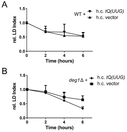 The identification of two different tRNA modifiers (Elongator and Deg1), which impact on soraphen A resistance and LD levels in a similar manner, suggests that translational defects are responsible for the observed LD and soraphen A phenotypes. Translational defects of different tRNA modification mutants can be rescued by overexpression of those tRNAs that become functionally affected in the absence of the modifications [12,18]. For Deg1, previous work identified a single tRNA (tRNAGlnUUG) to be functionally impaired in the absence of the modification Ψ38/39 [25,35]. Hence, we analyzed whether lipolysis defects in deg1 can be ameliorated upon overexpression of this tRNA. As shown in Figure 5, this is indeed the case. No significant difference in LD dynamics was observed in stationary phase wild type cells carrying empty vector or the tRNAGlnUUG overexpression construct upon refeeding (Figure 5A). In both, reduction of LD levels was observed. In contrast, deg1 mutants carrying the tRNA overexpression construct display an increased reduction of LD levels at 4 h and 6 h after refeeding as compared to the empty vector control (Figure 5B). These results support the interpretation that tRNA modification defects influence LD dynamics by translational defects, since the lipolysis defect of deg1 mutants can be ameliorated by overexpression of tRNAGlnUUG.