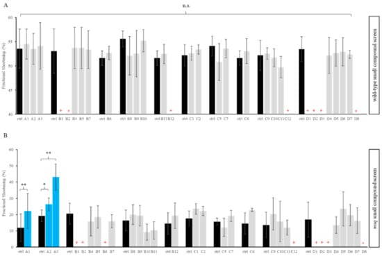 During small compound screening, as many as 8/32 (25.0%) compounds in wild-type zebrafish and 8/32 (25.0%) compounds in msq mutants led to lethality of more than 50% of compound treated zebrafish embryos. Except for the tyrosine phosphatase inhibitor RK-682 (B6) that was lethal in msq, and except for Deltamethrin (B12) that was lethal in wt zebrafish, all compounds leading to death in wild-type zebrafish were also lethal in msq (Table A1). In both study groups, Endothall (B3) was excluded from further statistical analysis, since more than 50% of zebrafish in the DMSO control group died. Thus, fractional shortening data were available for 23 (71.9%) compounds applied in both groups, wild-type siblings and mutant msq zebrafish embryos.