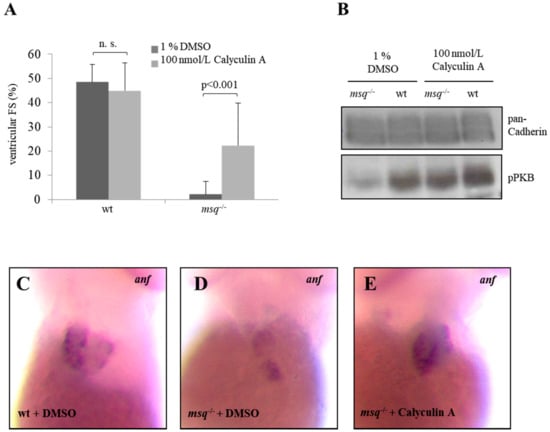 Calyculin A reconstitutes contractile force, PKB phosphorylation and anf expression in msq. (A) Ventricular FS of homozygous mutant msq embryos (msq−/−) in comparison to wild-type (WT) zebrafish. Homozygous msq embryos treated with 100 nmol/L calyculin A during 4–96 hpf displayed improved contractile force (25.4 ± 18.9% (p = 0.00015) compared to embryos incubated with DMSO (2.2 ± 5.3%). (n.s.: Not significant) (B) Treatment of homozygous msq−/− embryos with 100 nmol/L calyculin A displayed an increased PKB phosphorylation (pPKB) in comparison to controls. In situ hybridization revealed that calyculin A treated homozygous msq−/− embryos (E) show, in contrast to DMSO-treated wild-type zebrafish (C) and DMSO-treated msq−/− embryos (D), an almost indistinguishable anf expression.