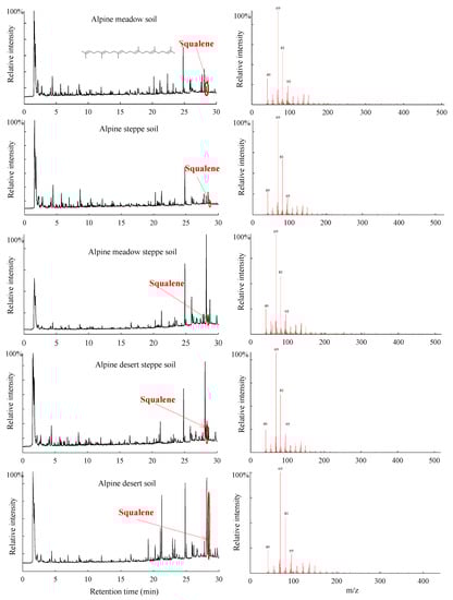 The Tibetan Plateau, the highest and most extensive highland in the world, is characterized by a harsh environment and fragile ecosystems at high altitude, with strong solar radiation, drought, low temperatures, and poor levels of oxygen []. In the present study, the squalene component was identified from five alpine grassland soils in the Tibetan Plateau by using the Py-GC/MS technique. Py-GC/MS served as a valuable analytical technique because pyrolysis products could be separated by gas chromatography and detected by mass spectrometry. The data by Py-GC/MS do not provide insight into the absolute abundance of compounds across samples, an approach that would require multiple internal standards. However, it is an efficient tool for revealing chemical characteristics in the organic matter of soils through semi-quantitative analyses with a comparison of abundance ratios of selected pyrolysis products [,,]. A squalene component was found from all the soils in the five alpine grasslands, with relative abundance ranging from 0.93% to 10.66% in the Tibetan Platea, as shown using the Py-GC/MS technique (Figure 1 and Figure 2). Nevertheless, at present the squalene component has only been found in very few soils in other regions, such as tropical rainforest soils in Indonesia [], temperate broadleaved forest soils in Belgium [], Mediterranean forest soil located in Spain [], and agricultural soil in Canada []. For most of the soils, the squalene component was not obtained using the same technique [,,,,].