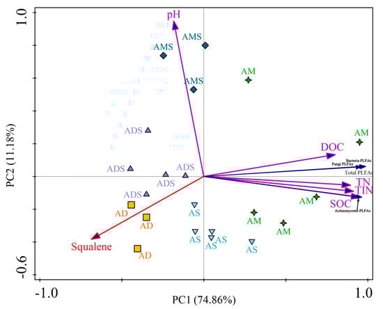 Two principal components were used as tools to distinguish the different grassland ecosystems (AM, AS, AMS, ADS, and AD), considering all properties together (SOC, DOC, TN, TIN, pH, PLFAs, and relative abundance of squalene). The cumulative variation in the distribution of the selected variable was 74.86% and 86.04% for the sum of the principal components PC1 and PC2 in the evaluation performed with soil chemical traits and PLFAs (Figure 3). The analysis of the interaction showed an integrated effect of the grassland ecosystem, soil chemical characteristics, and PLFAs on the relative abundance of soil squalene. For soil chemical characteristics, the relative abundance of squalene had a negative correlation with SOC (r = −0.616, p < 0.01), DOC (r = −0.510, p < 0.05), TN (r = −0.612, p < 0.01), and TIN (r = −0.579, p < 0.01). Nevertheless, the squalene relative abundance was not in correlation with soil pH. For soil microbial characteristics, the relative abundance of squalene was also significantly negatively correlated with soil PLFA quantity, including soil total PLFA (r = −0.642, p < 0.01), bacteria PLFAs (r = −0.650, p < 0.01), fungi PLFAs (r = −0.576, p < 0.01), and Actinomycete PLFAs (r = −0.583, p < 0.01).