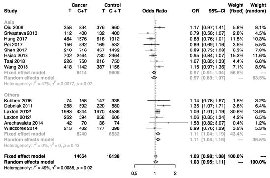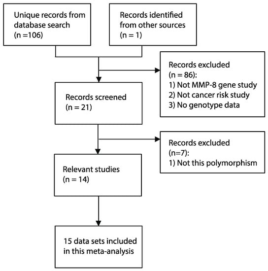 The workflow for the literature screen and data selection fully revealed our rigid adherence to the PRISMA guidelines (Figure 1). A systematic literature search in five databases found 106 unique manuscripts. Additionally, one breast cancer study [23] citing the article for melanoma risk [13] was identified in citation analysis by Google Scholar. This study for breast cancer risk contained two different cohorts from Poland and the United Kingdom [23]. By implementing the predefined exclusion and inclusion criteria, 15 independent data sets were identified [13,16,23,24,25,26,27,28,29,30,31,32,33,34]. In total, 7375 cancer samples and 8117 controls were included. The characteristics of 15 data sets involved in our meta-analysis are summarized in Table 1. Specifically, the evaluation for methodological quality revealed that 14 of the data sets included are of moderate or high quality. Summarized genotype data was shown in Table 2. The T allele frequencies in the control group of the Asian and non-Asian subdivisions were generally consistent with those reported in several previous genomic studies with large populations (https://www.ncbi.nlm.nih.gov/snp/rs11225395#frequency_tab), such as the Population Architecture using Genomics and Epidemiology study (PAGE, http://www.pagestudy.org/), the 1000 genome project (1000 G) [35], and the genome Aggregation Database (gnomAD, https://gnomad.broadinstitute.org/).