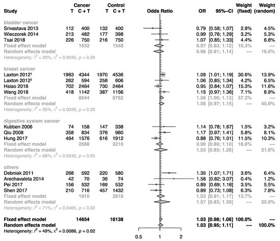 Forest plot showing the association between the MMP-8 rs11225395 polymorphism and cancer risk in subgroup analysis by cancer type. The pooled estimates were calculated under the allele model. The size of each gray square is proportional to the weight calculated under the fixed effect model, a black dot in a box indicates the odds ratio (OR), and black lines on either end mark the corresponding 95% confidence interval (CI). The gray diamonds represent the overall summary estimate, with 95% CI represented by their widths. The dotted vertical line and the dashed one indicate the pooled ORs calculated by the random effects model and fixed effect model, respectively. The black unbroken vertical line marks the null hypothesis (OR = 1). † marks the population of the United Kingdom in Laxton’s study (2012), and ‡ marks the population of Poland in Laxton’s study (2012).