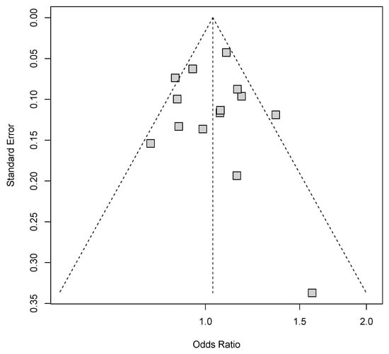 Funnel plot for publication bias under the allele model. Each gray square represents one single study involved in this meta-analysis.