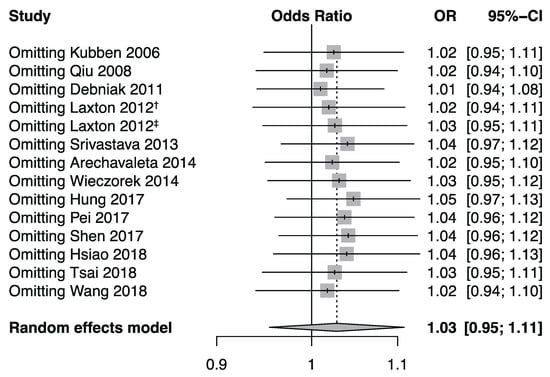 Forest plot for sensitivity analysis under the allele model. Pooled estimates were calculated using the random effects model. The named study was omitted to reappraise the association between the MMP-8 rs11225395 polymorphism and cancer risk. † marks the population of the United Kingdom in Laxton’s study (2012), and ‡ marks the population of Poland in Laxton’s study (2012).