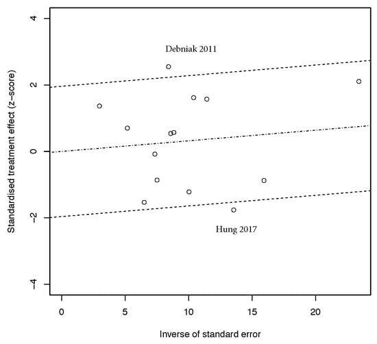 - Egger, M.; Smith, G.D.; Schneider, M.; Minder, C. Bias in meta-analysis detected by a simple, graphical test. BMJ 1997, 315, 629–634. [Google Scholar] [CrossRef]